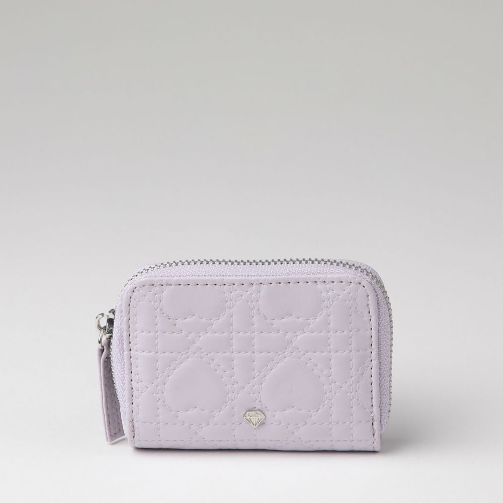 Billetera chica cierre ecocuero lila quilted corazones. Apertura tipo acordeon con capacidad para 2 tarjetas.