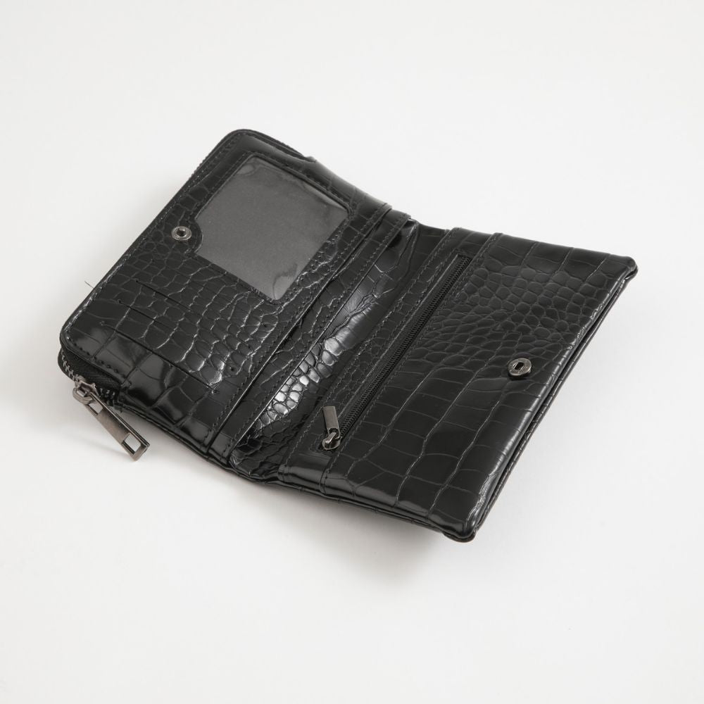Billetera blanda mediana ecocuero estampado cocodrilo negro con tachas. Espacio amplio con cierre, espacio para 4 tarjetas, 4 espacios abiertos y 1 monedero interior.