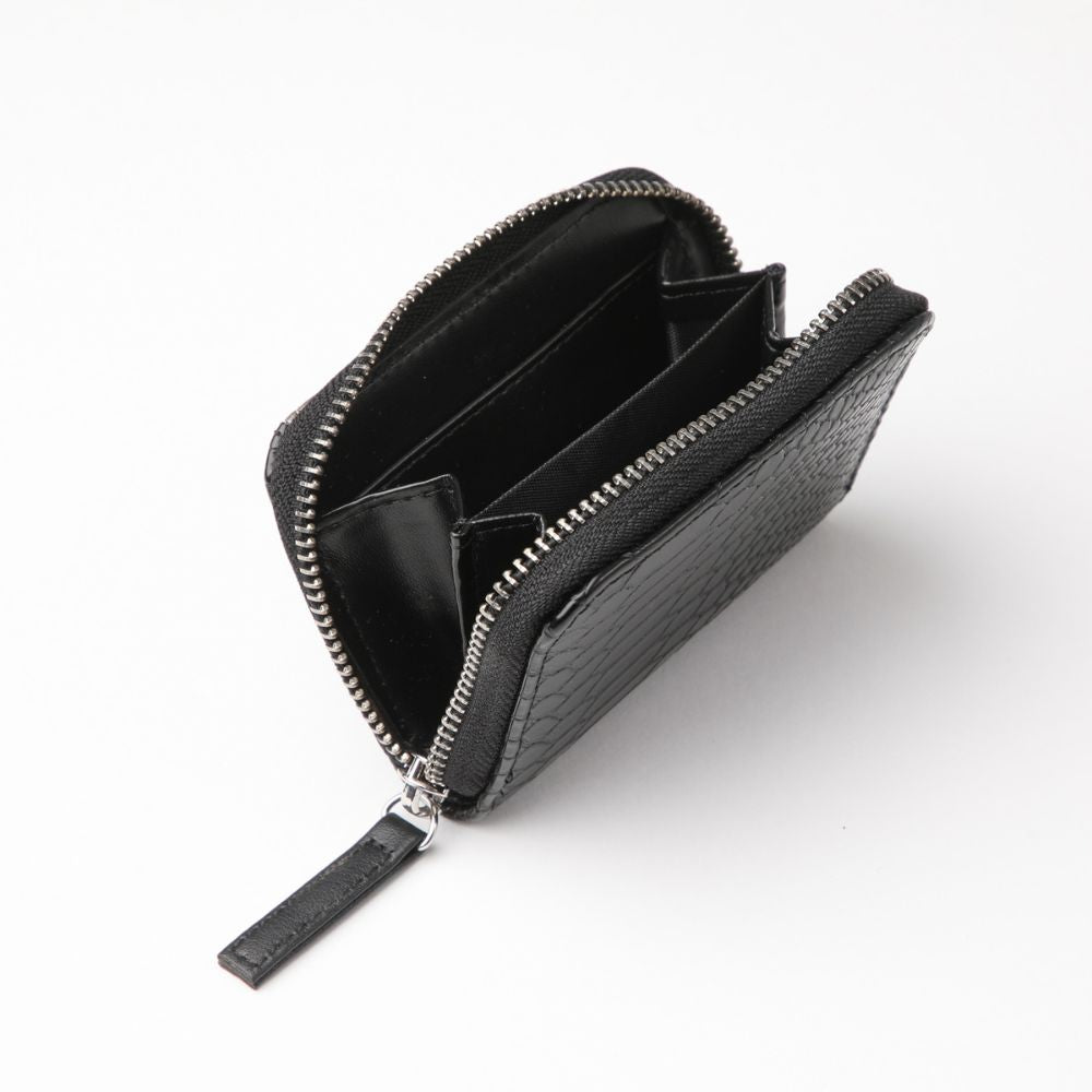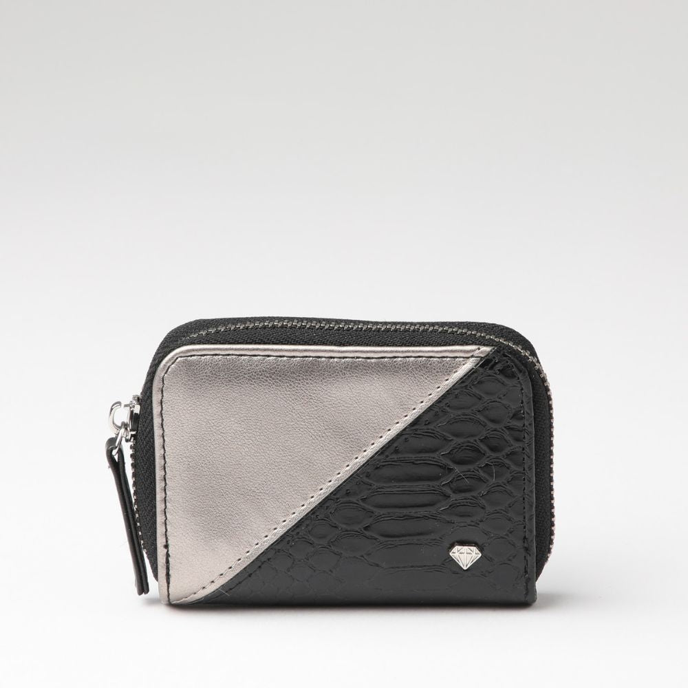 Billetera chica cierre ecocuero negro texturado y plateado. Apertura tipo acordeon con capacidad para 2 tarjetas.