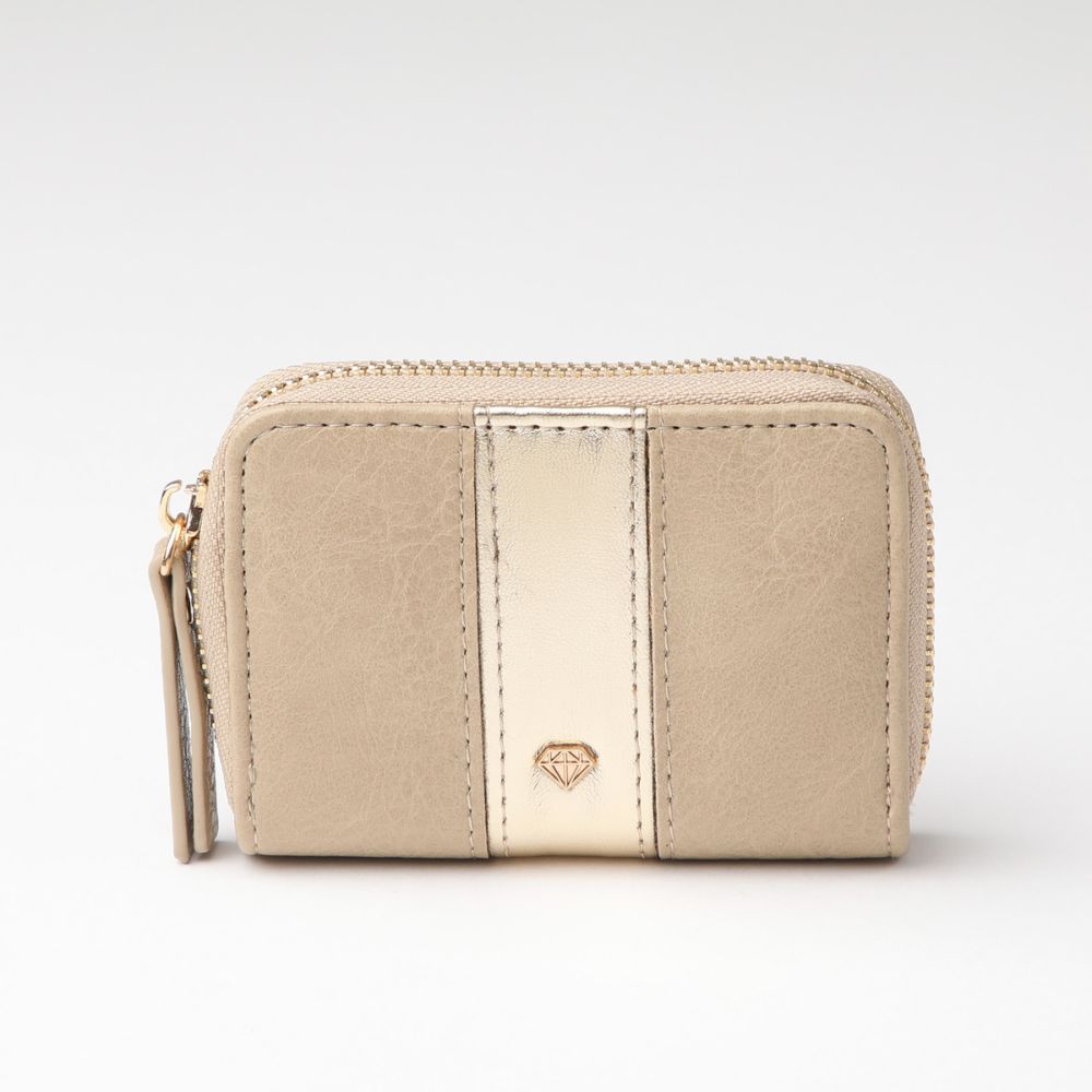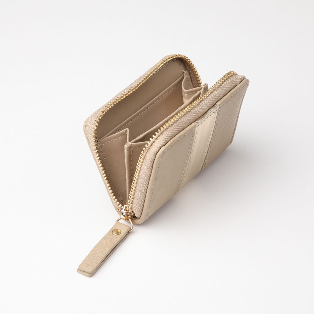 Billetera chica ecocuero beige y linea dorada metalizada. Apertura tipo acordeon con capacidad para 2 tarjetas.