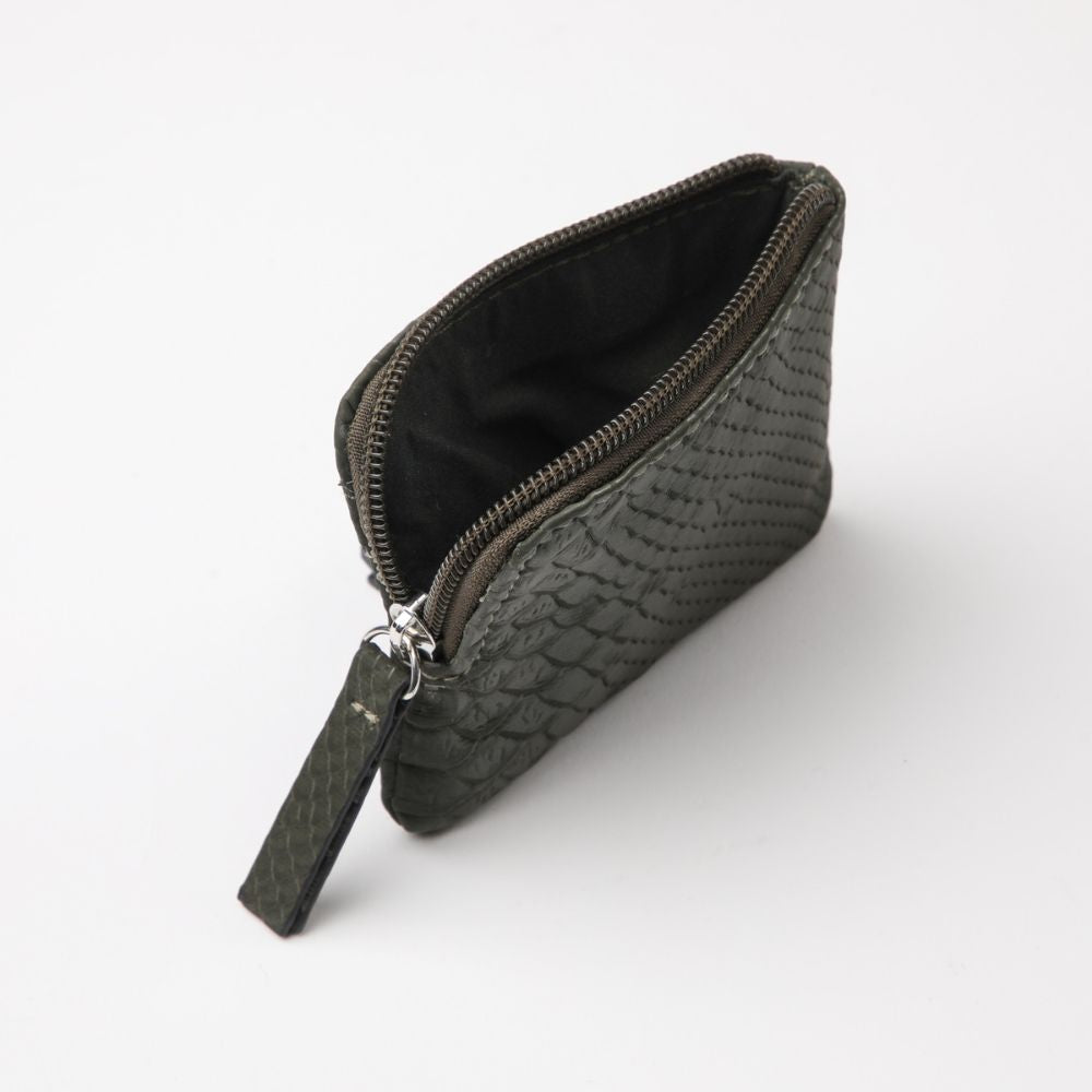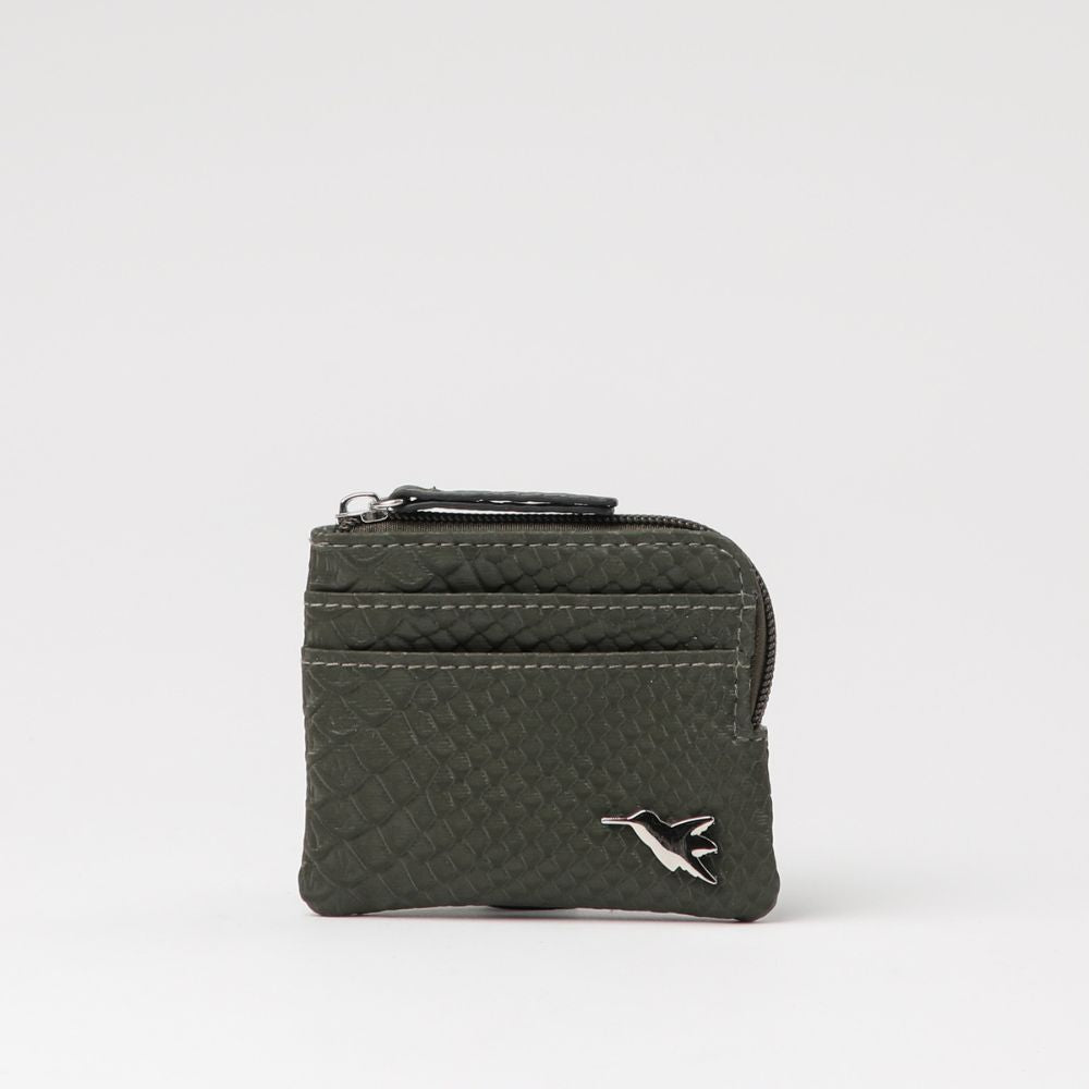 Billetera chica blanda con cierre de ecocuero reptil verde. Tiene capacidad para dos tarjetas y monedero
