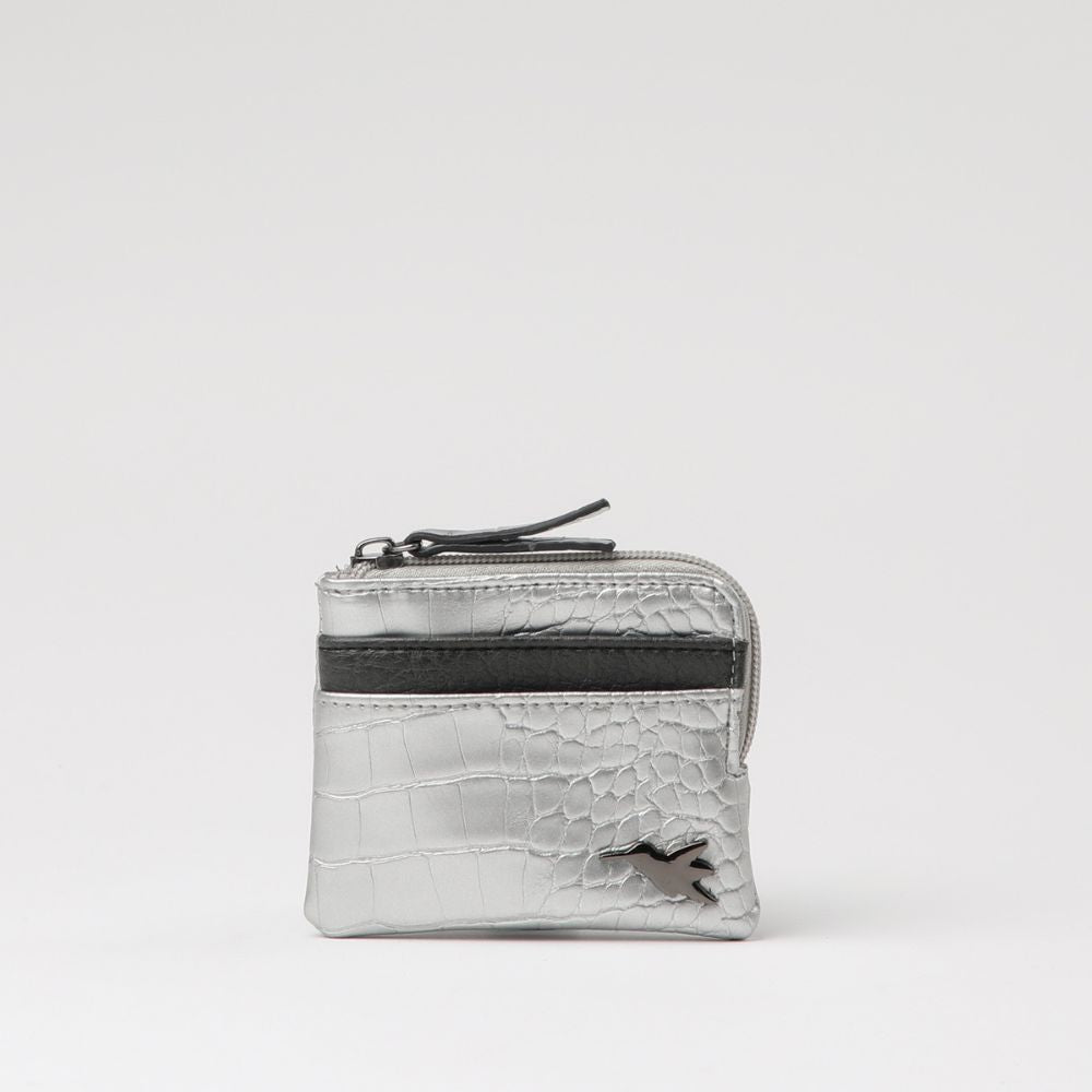 Billetera chica blanda con cierre de ecocuero croco negro con tachas. Tiene capacidad para dos tarjetas y monedero