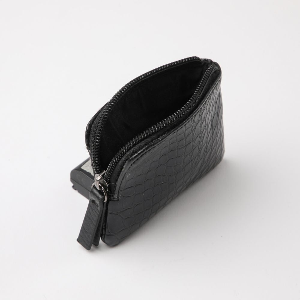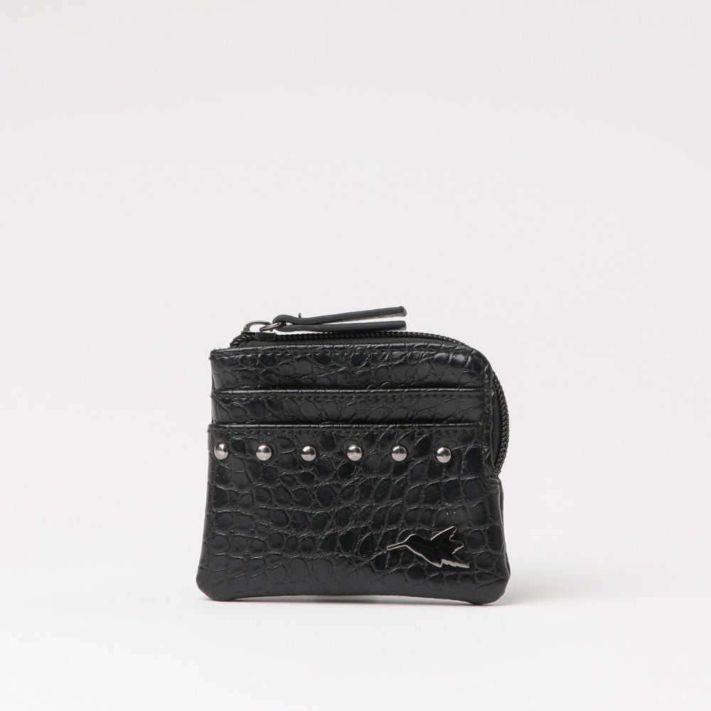 Billetera chica blanda con cierre, de ecocuero croco plateado y ecocuero negro. Tiene capacidad para dos tarjetas y monedero
