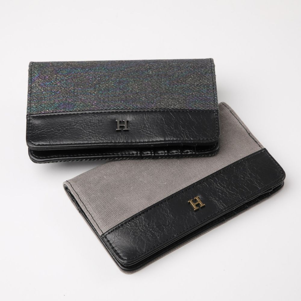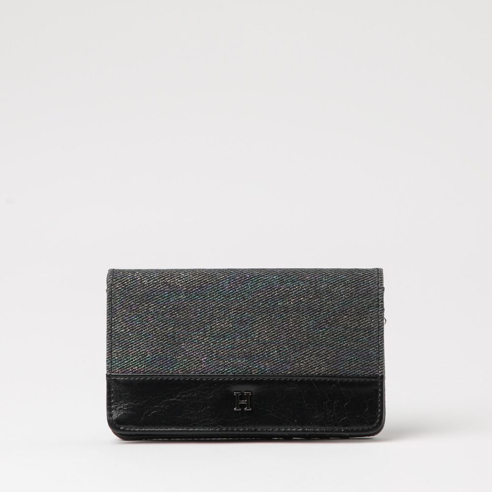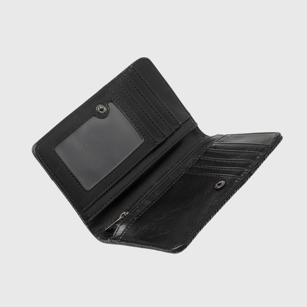 Billetera con broche tipo libro de ecocuero negro con tela efecto tornasol. Interior de ecocuero con espacio para nueve tarjetas, dinero en efectivo y monedero con cierre dorado.