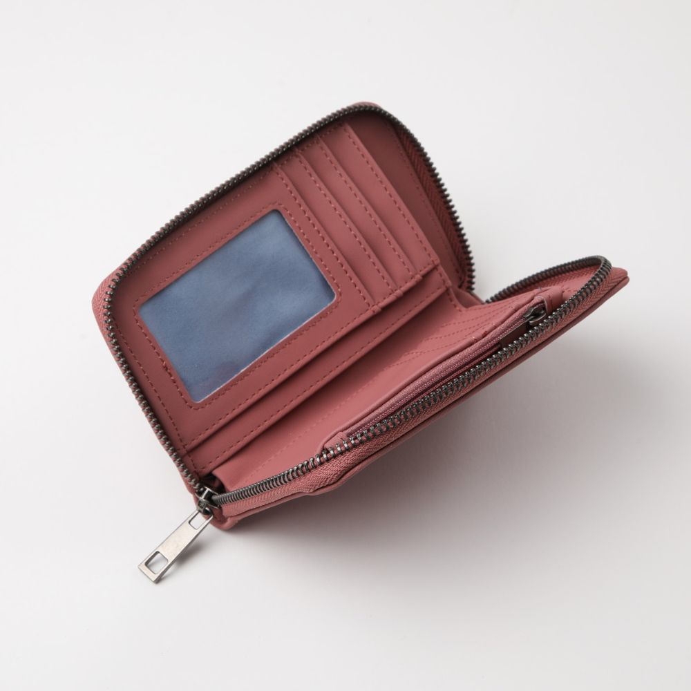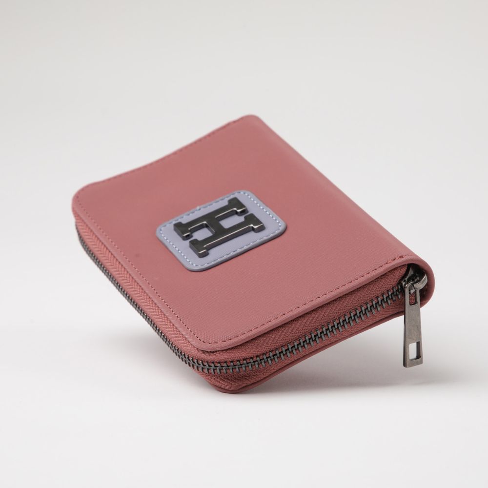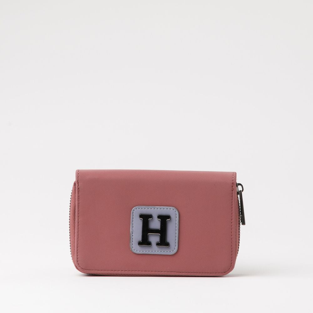 Billetera con cierre de nylon rosa palo con "H" metálica al centro en parche morado. Interior rosado con capacidad para siete tarjetas.
