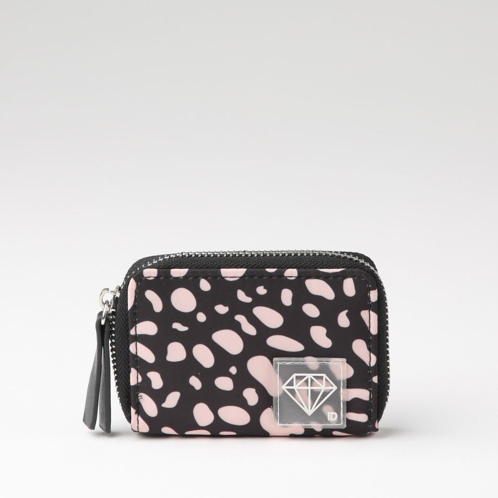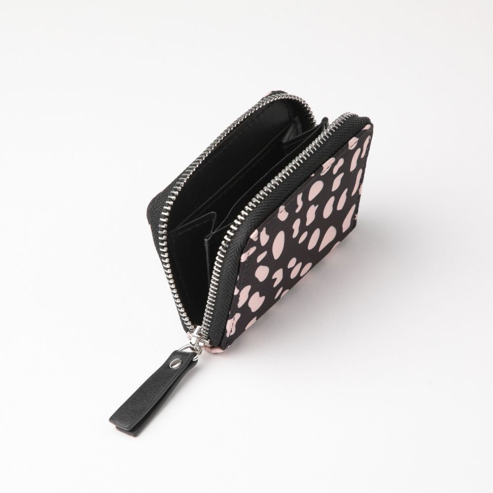 Billetera chica cierre nylon esyampado manchas blanco y negro. Apertura tipo acordeon con capacidad para 2 tarjetas.