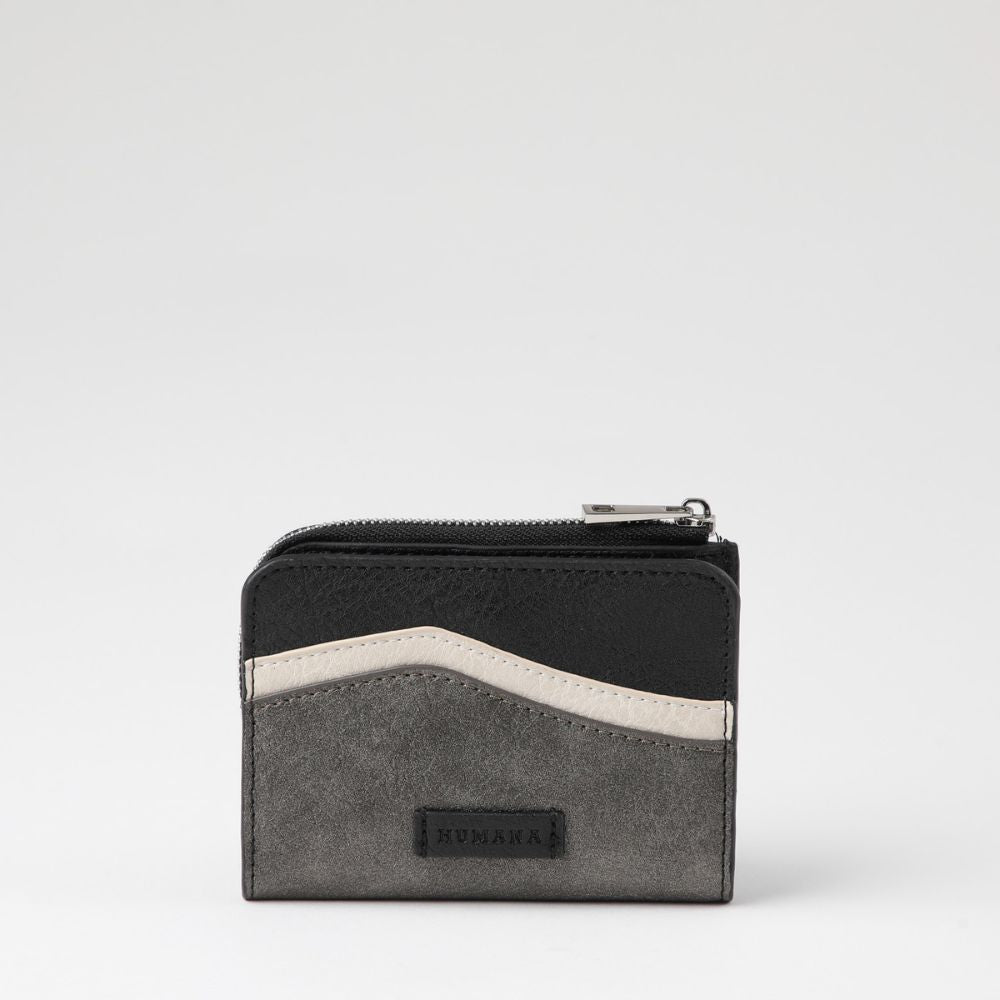 Billetera chica ecocuero plateado, negro y blanco. Capacidad para 8 tarjetas y monedero con cierre.