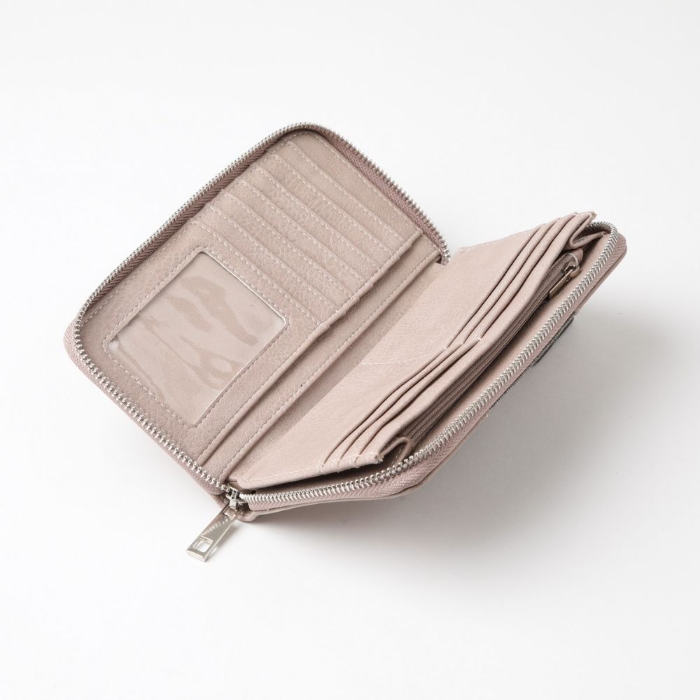 Billetera grande de ecocuero color beige liso y tela café en medio con tachas redondas, tipo libro con cierre. Con espacio para 13 tarjetas, y 5 compartimientos donde uno de ellos tiene cierre.