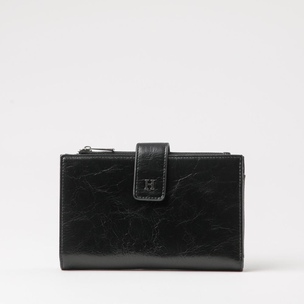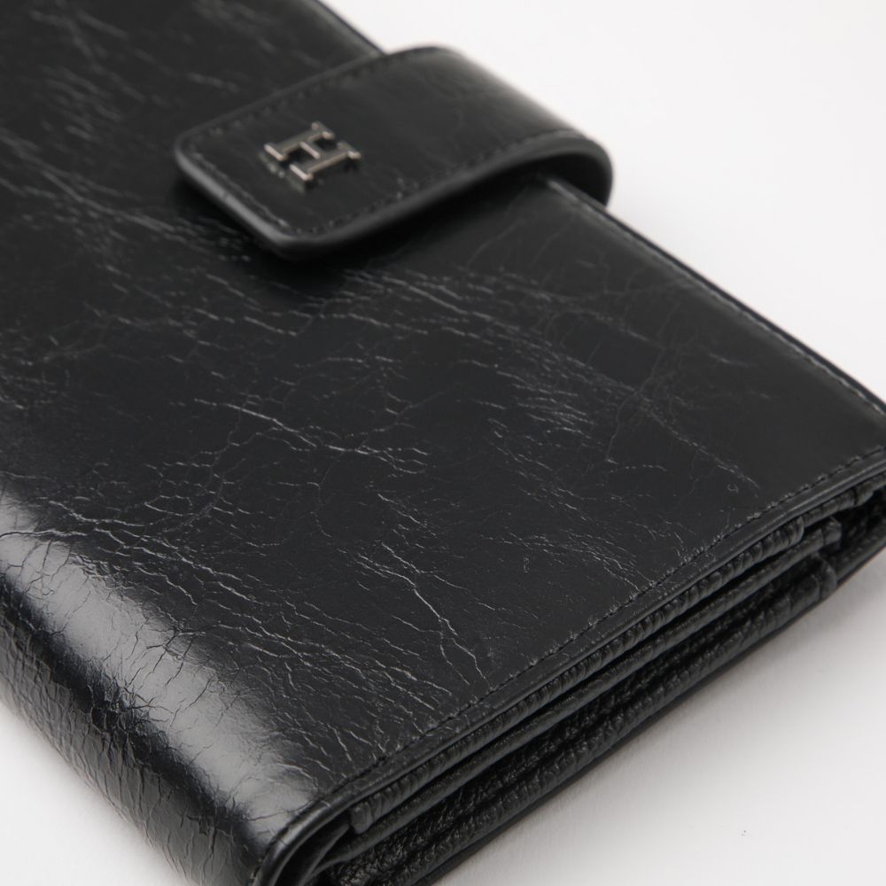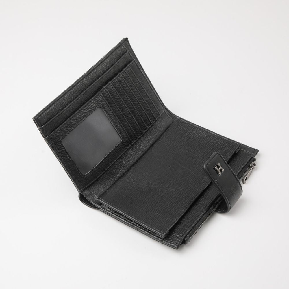 Billetera grande tipo libro con cierre clip de ecocuero negro. Tiene capacidad para siete tarjetas, cinco espacios abiertos y un monedero con cierre.