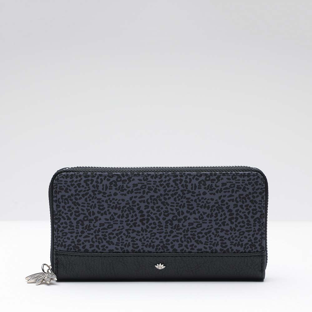 Billetera Grande iD Cobalto de color negro. Billetera con animal print gris con manchas negras, y desde la parte frontal inferior hasta la parte posterior completa tiene ecocuero negro. En el interior está separada en dos partes, ambas con espacio para t