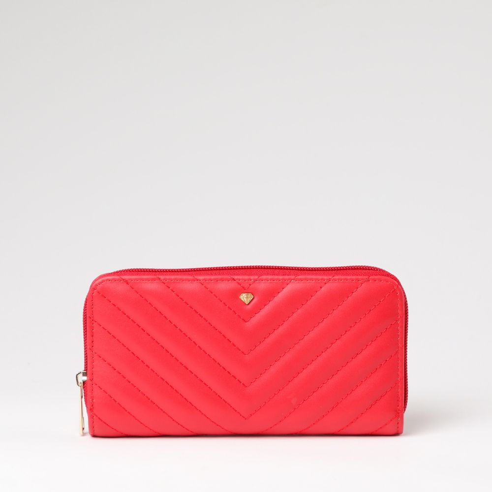 Billetera grande de ecocuero rojo acolchada en lineas, tipo acordeón con espacio para doce tarjetas y monedero con cierre.