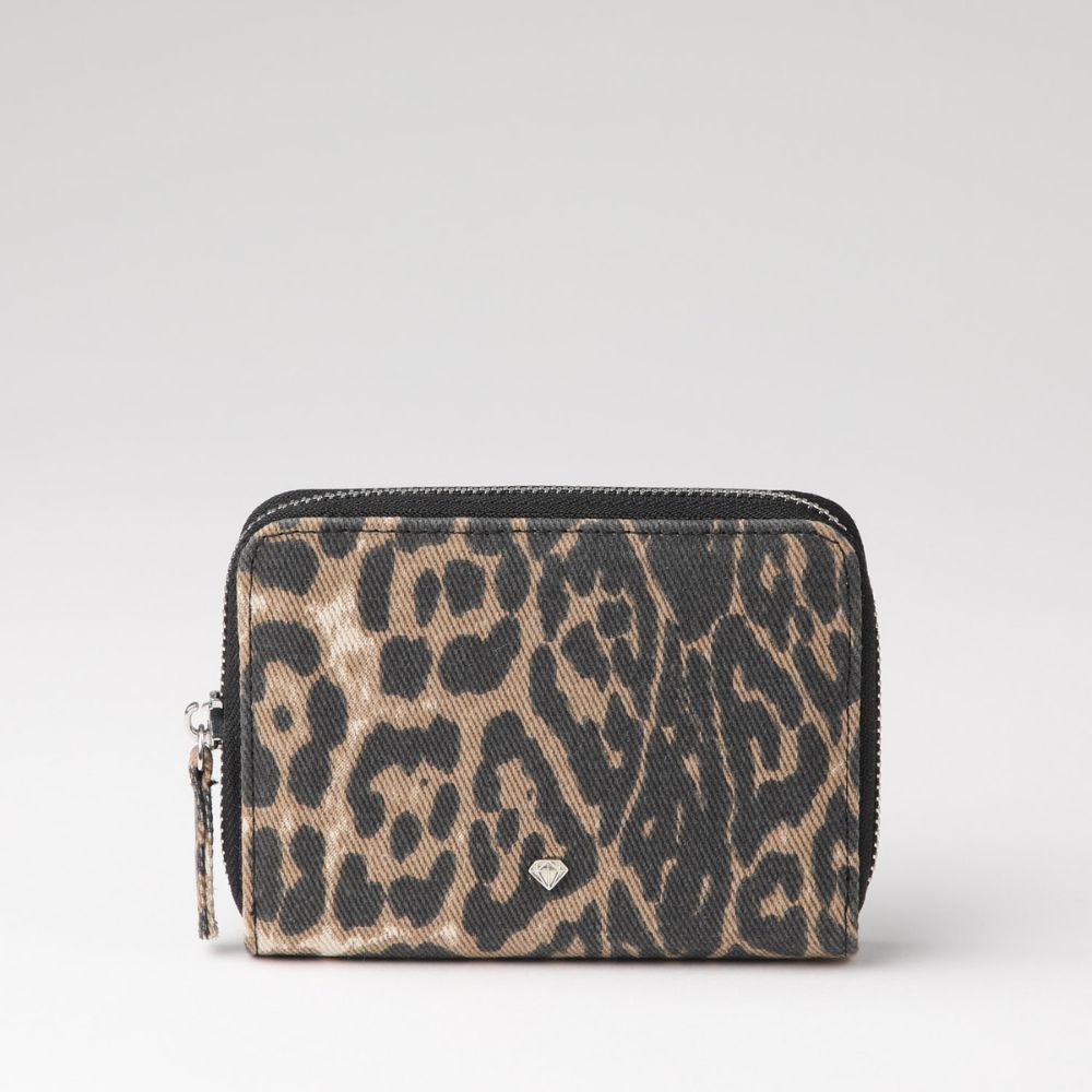 Billetera mediana tela animal print. Apertura tipo acordeón con capacidad para 6 tarjetas y monedero interior.