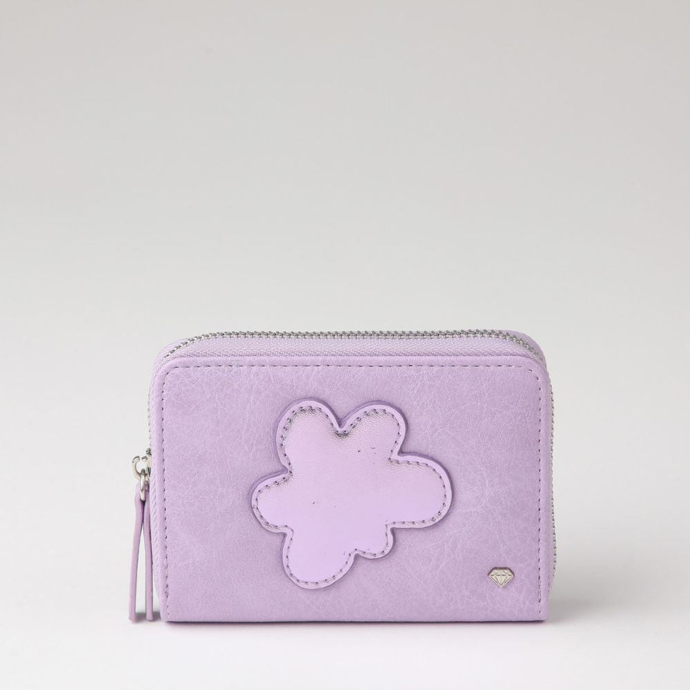 Billetera mediana ecocuero lila estrella metalizadalila. Apertura tipo acordeón con capacidad para 6 tarjetas y monedero interior.