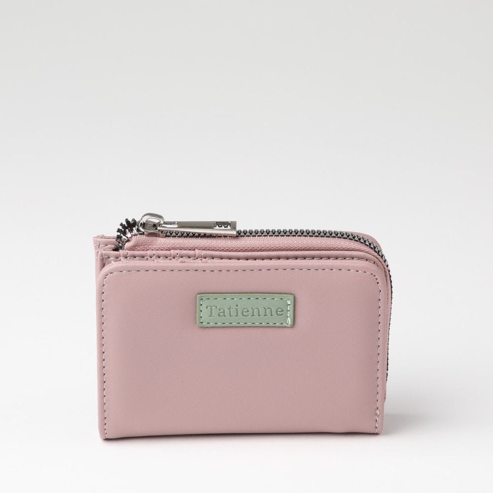 Billetera mediana doble tela tipo nylon rosado y verde. Capacidad para 8 tarjetas, dinero en efectivo y monedero con cierre externo.