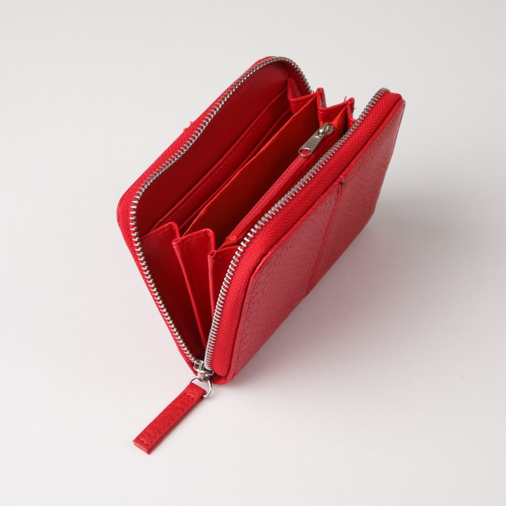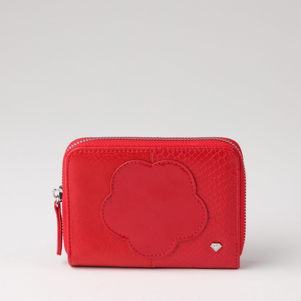 Billetera mediana ecocuero rojo texturado con flor. Apertura tipo acordeon con capacidad para 6 tarjetas y monedero interior.