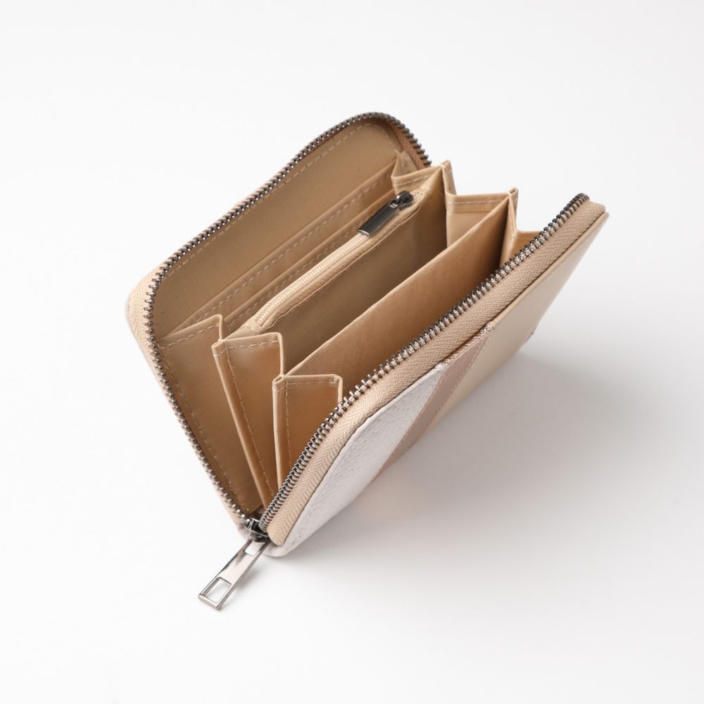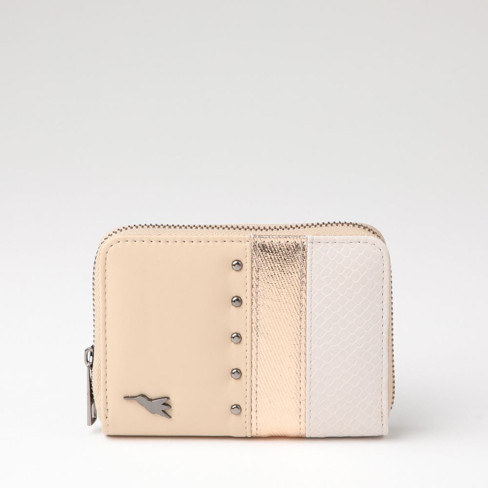 Billetera mediana ecocuero estampado serpiente blanco y liso beige. Capacidad para 6 tarjetas, 3 espacios abiertos y monedero con cierre interno.