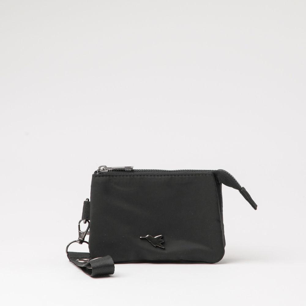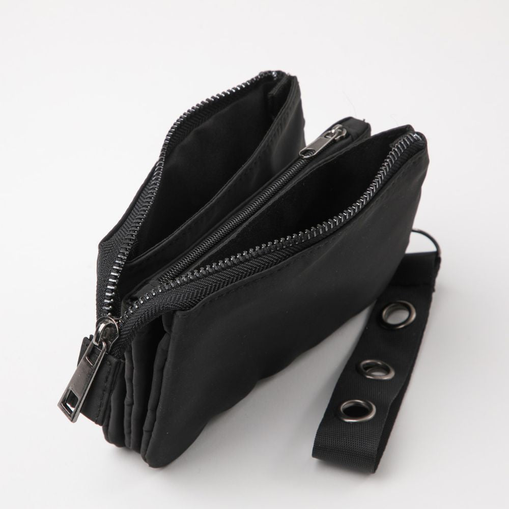 Billetera tipo monedero negro con cierre. Dentro tiene tres compartimientos , dos sin cierre y uno con. Cuenta con una correa removible con remaches para llevarla.