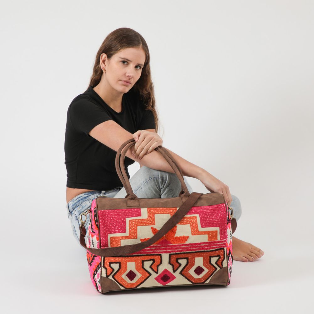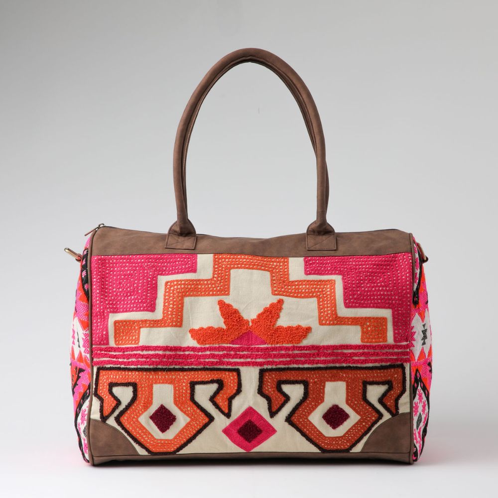 Bolso rectangular con dos asas y correa ajustable/desmontable para utilizarlo al hombro o cruzado. El bolsillo principal lleva cierre y en su interior incluye otro bolsillo con cierre. El frente esta decorado con bordados boho en rosado, naranjo, café y morado sobre tela beige, y los costados son de tela boho con beige, negro, rosado y naranjo. Los bordes, base, asas y reforzamiento de la correa son de ecocuero café y la correa es de tela café. Los tiradores, argollas y ganchos son de metal dorado oscuro.