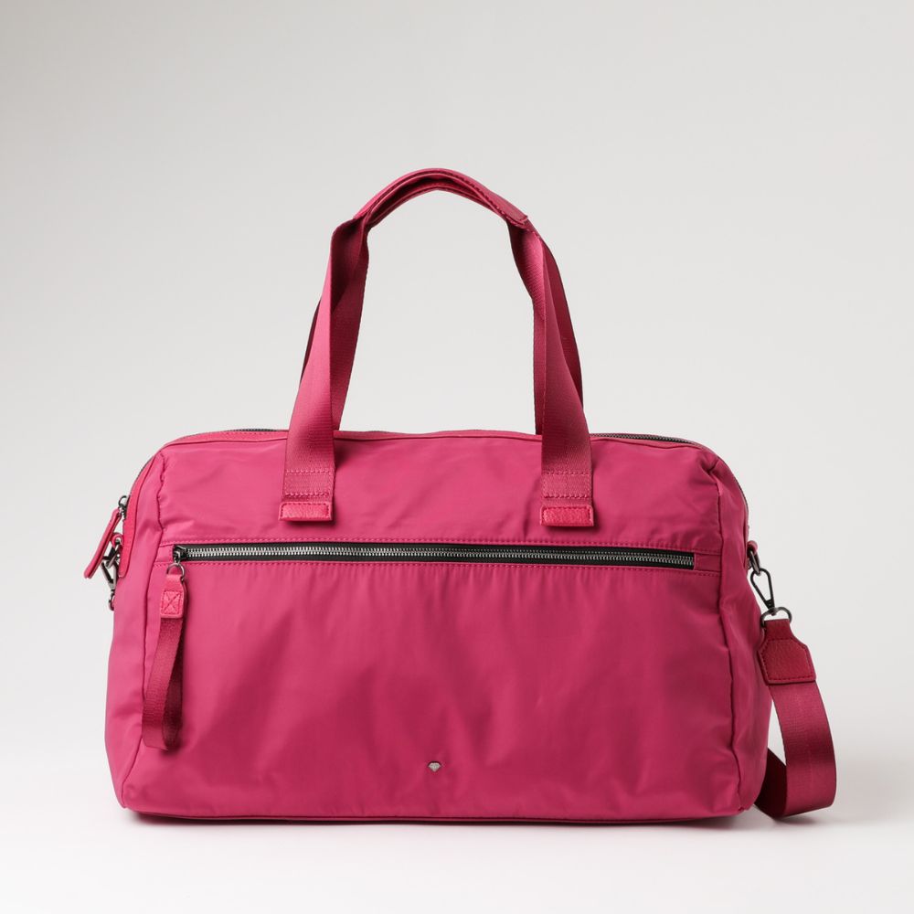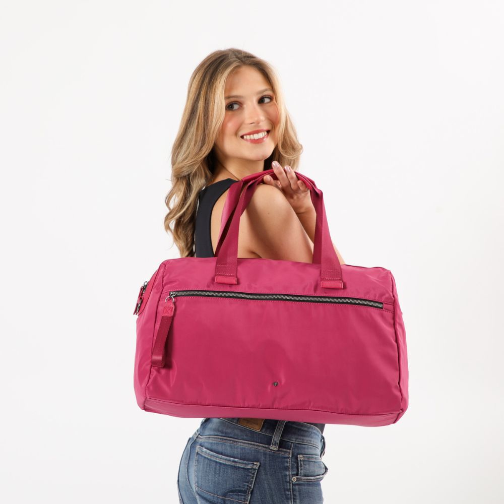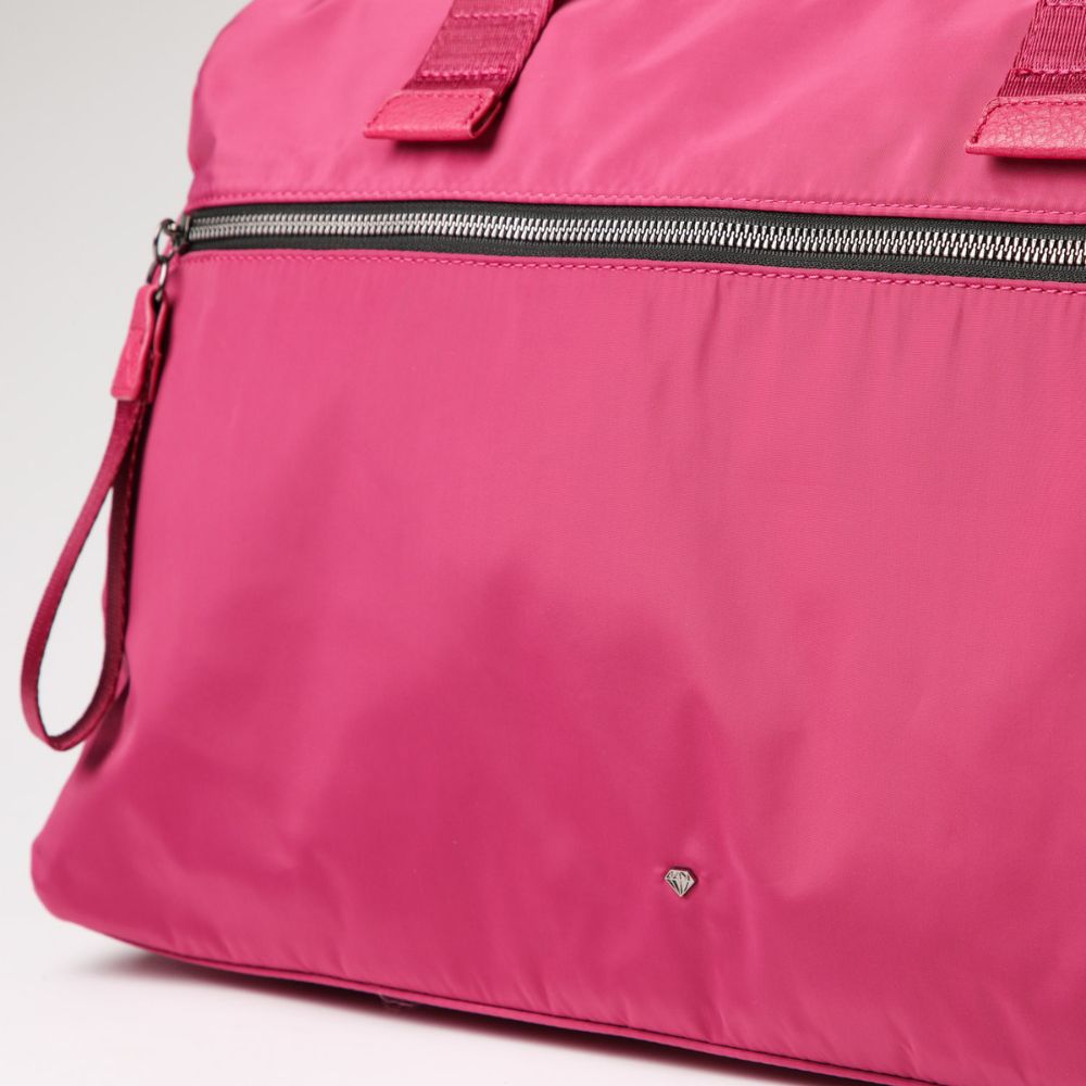 Bolso morado de ecocuero con dos asas y correa ajustable/desmontable para llevarlo al hombro o cruzado. Por el frente tiene un bolsillo con cierre y por el interior hay un bolsillo con cierre y dos abiertos. Las asas, correa, el borde del cierre y el tirador del bolsillo del frente son de ecocuero y nylon. La cinta de los cierres son negras y los cierres, hebillas, argollas, ganchos y logo son de metal plateado oscuro.