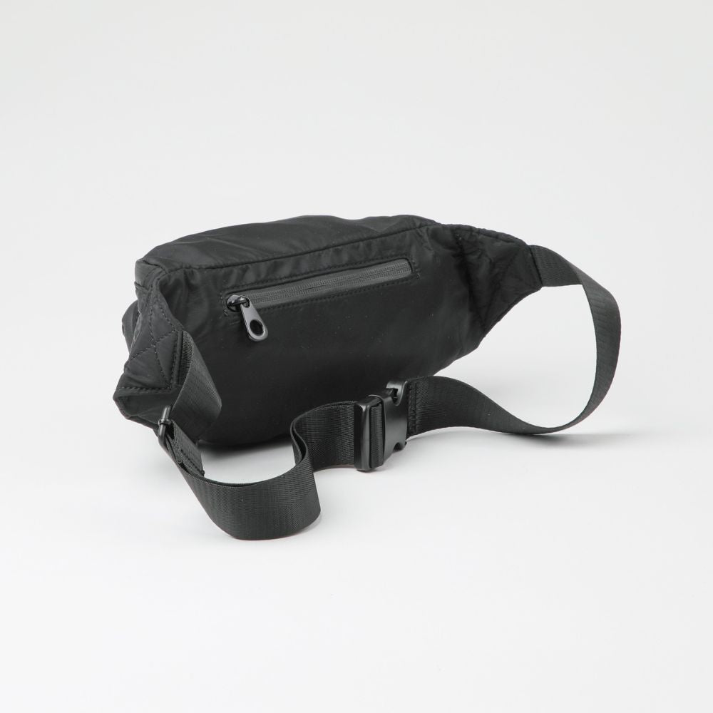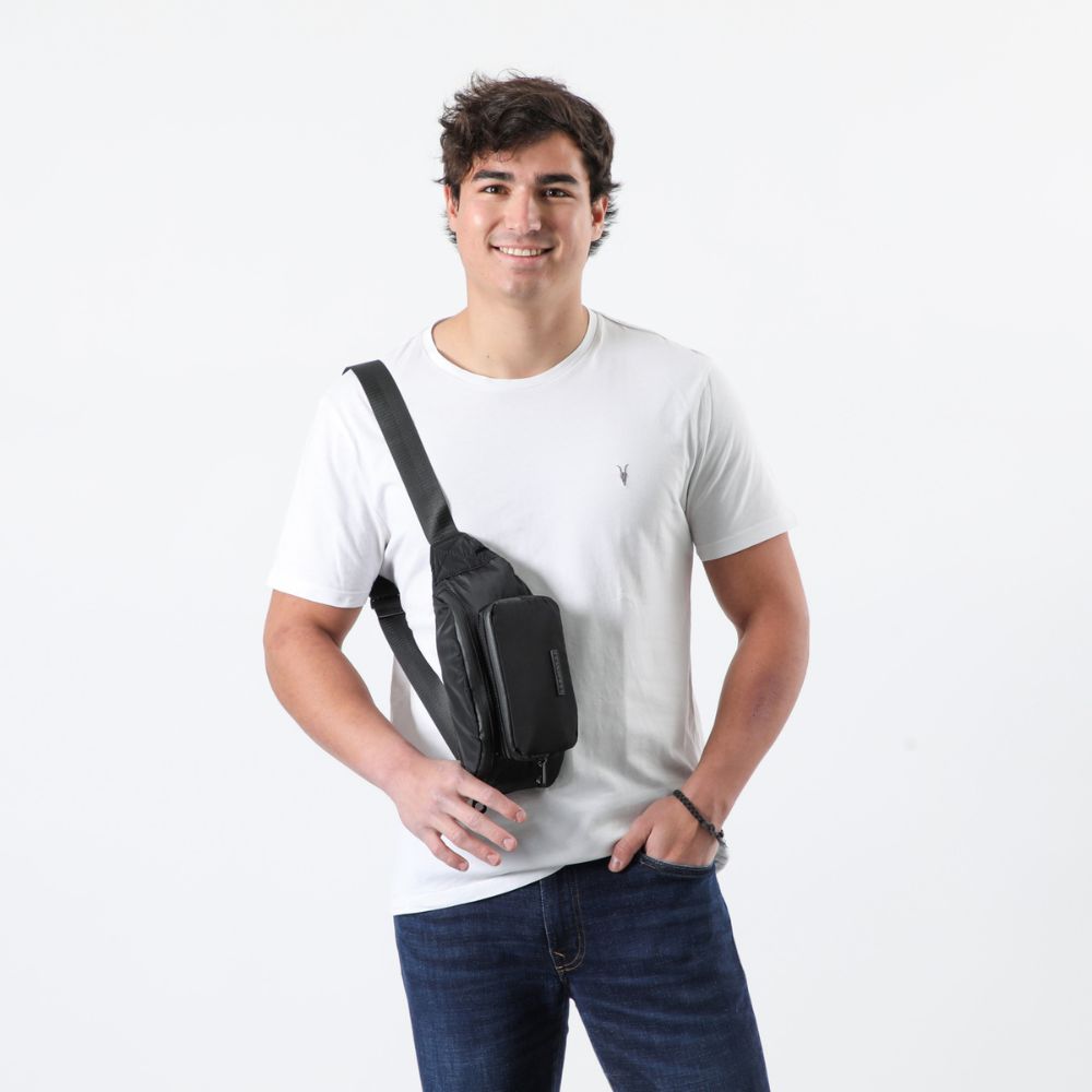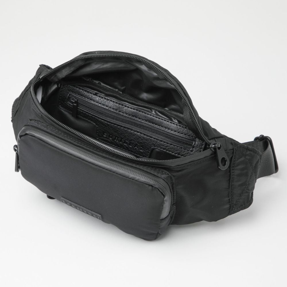 Banano de nylon negro con cierre y correa de tela con broche y hebilla para ajustar el largo. Su interior es de material impermeable y lleva un bolsillo con cierre por el frente y otro en el interior. Los cierres, broche, hebilla y logo son negros.