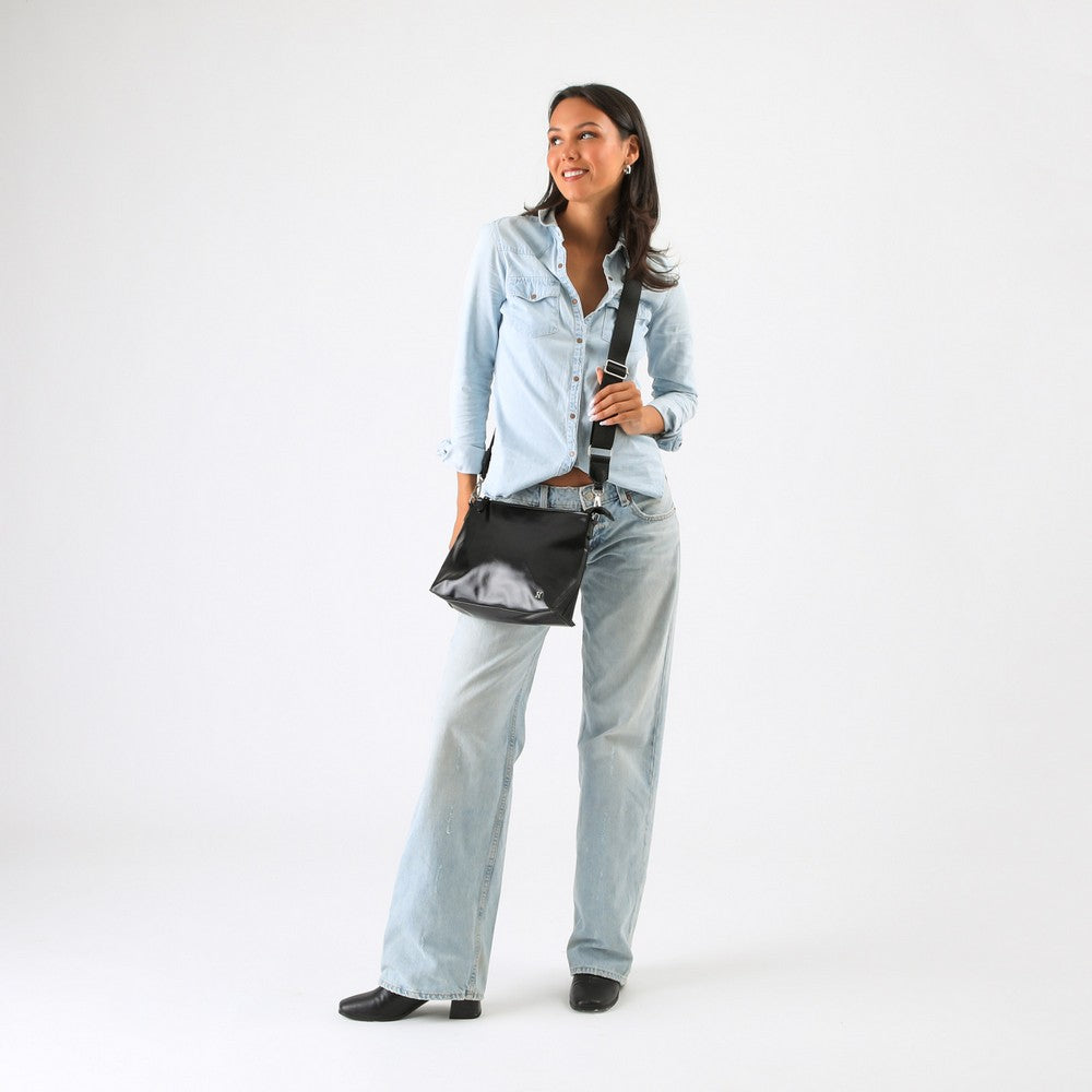 Cartera cruzada de eco-cuero con un acabado brillante. Tiene cierre superior plateado, correa ancha regulable y herrajes en tono plateado. El interior incluye bolsillo con cierre para organizar lo esencial. Un modelo práctico y moderno para el día a día.