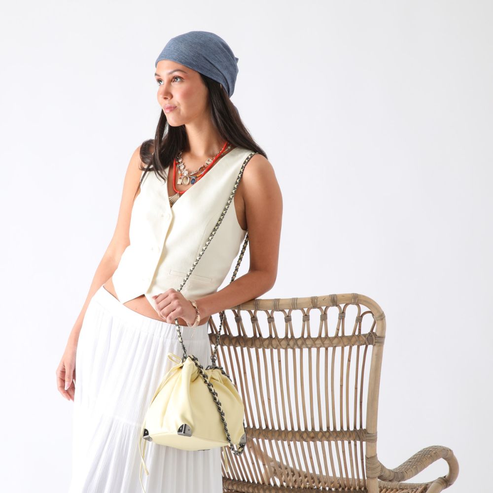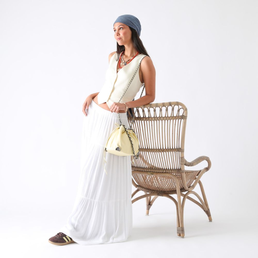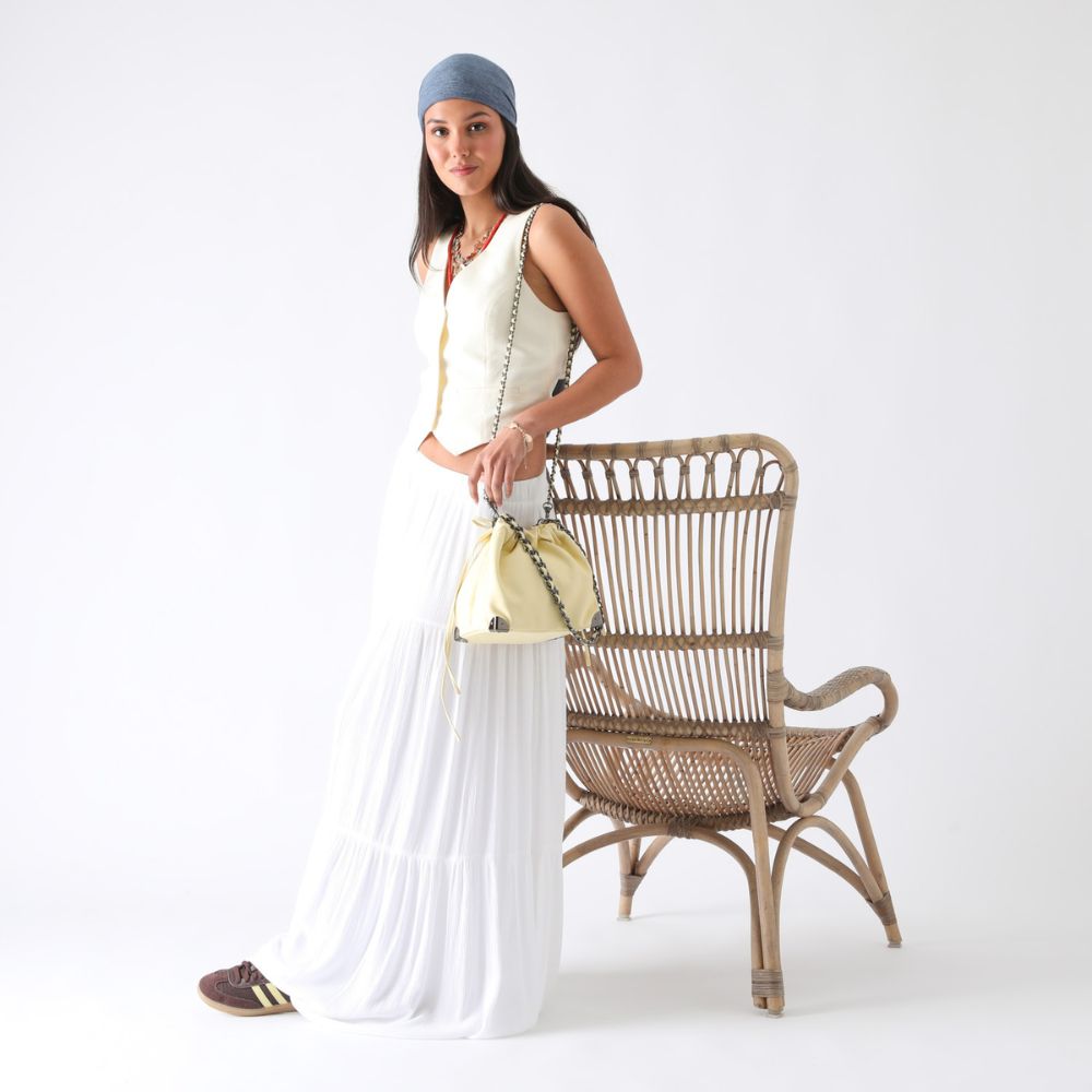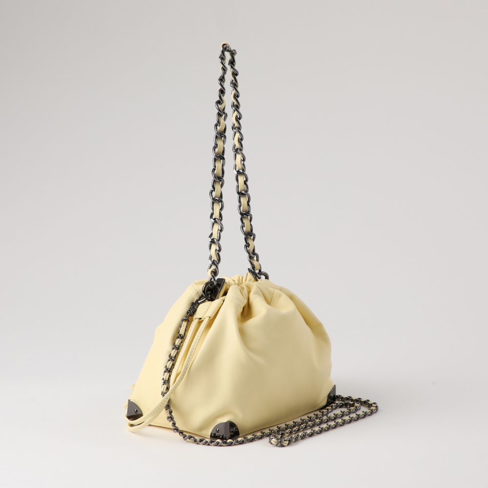 Cartera de ecocuero amarillo pastel con imán. Tiene dos cadenas con reforzamiento de ecocuero, para llevarla cruzada o al hombro. También tiene cuerdas para ajustar el tamaño de la cartera en ambos lados. Al interior tiene un bolsillo con cierre y dos abiertos. Tiene una base dura junto a un tope metálico en cada esquina. Las argollas y cadena son de metal plateado oscuro.