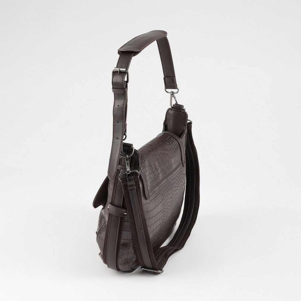 Bandolera de ecocuero café con textura cocodrilo, con tapa estructurada y terminaciones en broche decorativo. Incluye bolsillo interior con cierre, correas ajustables (una acolchada y otra de cinta) y logo H metálico al frente. De uso práctico para el día a día. Un diseño moderno y estiloso.