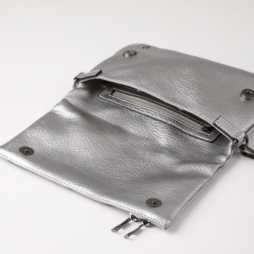 Cartera de ecocuero plateado con correa ajustable que permite llevarla cruzada. Tiene una solapa que se cierra con dos imánes. En su interior tiene un bolsillo con cierre. El cierre, logo y tiradores son de metal plateado.
