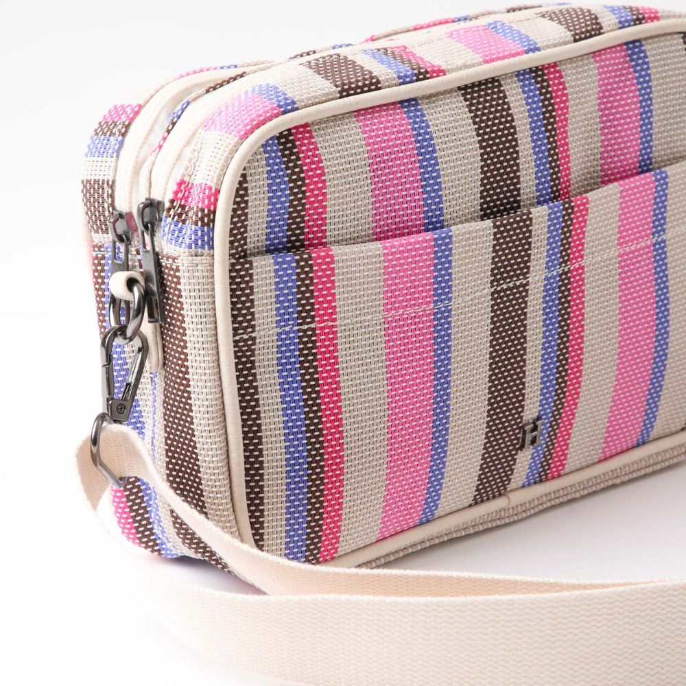 Cartera micro tejida en tonos rosados, café, beige y violeta. Trae una correa ajustable y desmontable color beige. Tiene dos compartimentos con cierre y en el frente tiene un bolsillo con imán.