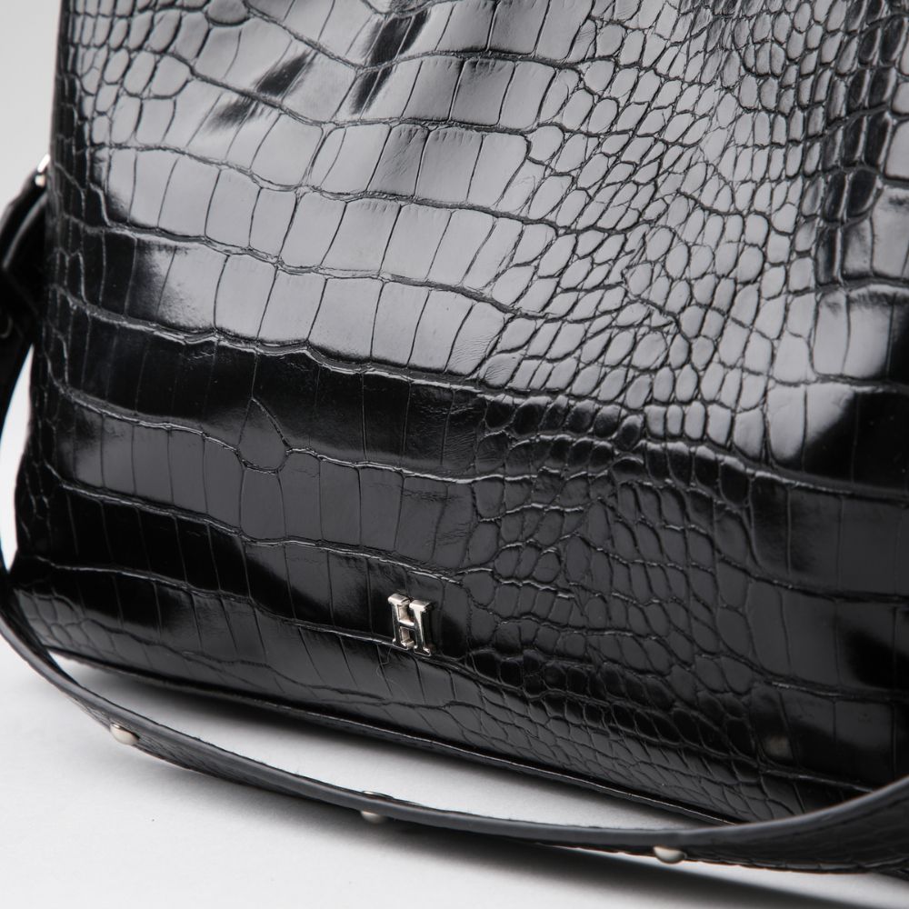Cartera de ecocuero negro con imán. Tiene una correa que permite llevarla cruzada y al interior tiene tres compartimentos y uno de ellos tiene cierre. El segundo compartimento tiene dos bolsillos con cierre y el otro dos bolsillos abiertos. En la cara trasera tiene un bolsillo con cierre. El snap, tachas, tiradores y logo son de metal plateado oscuro.