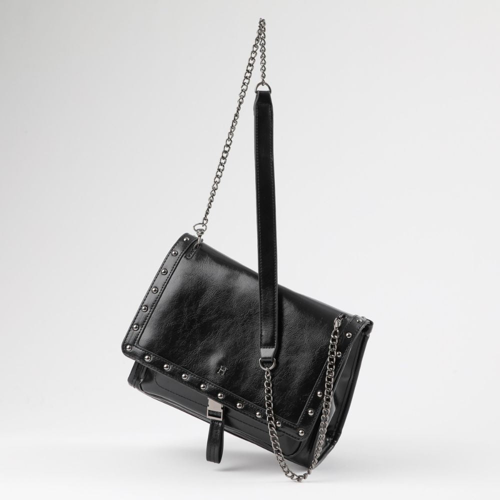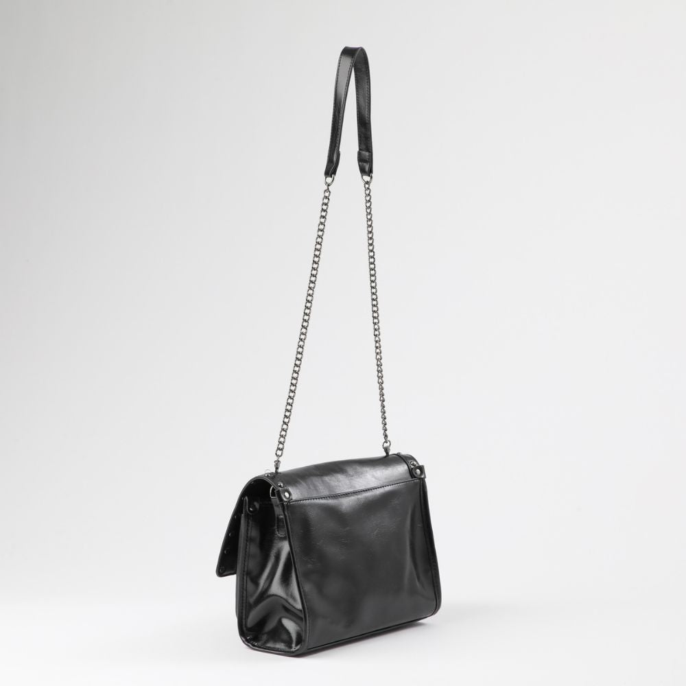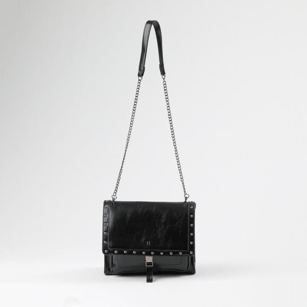 Cartera bandolera de ecocuero negro, solapa con imán y una correa tipo cadena con ecocuero. Tiene dos compartimentos, uno tiene dos bolsillos abiertos y uno con cierre. En el frente tiene tachas circulares. El logo, tachas, hebillas y tiradores son de metal plateado oscuro.