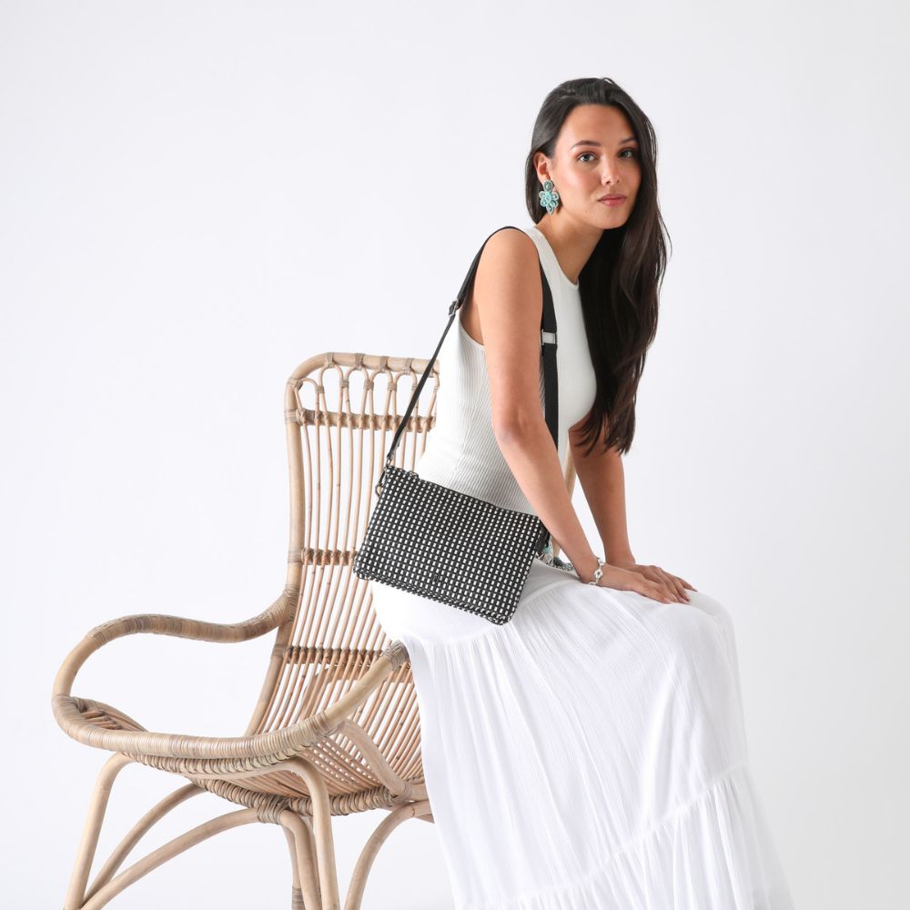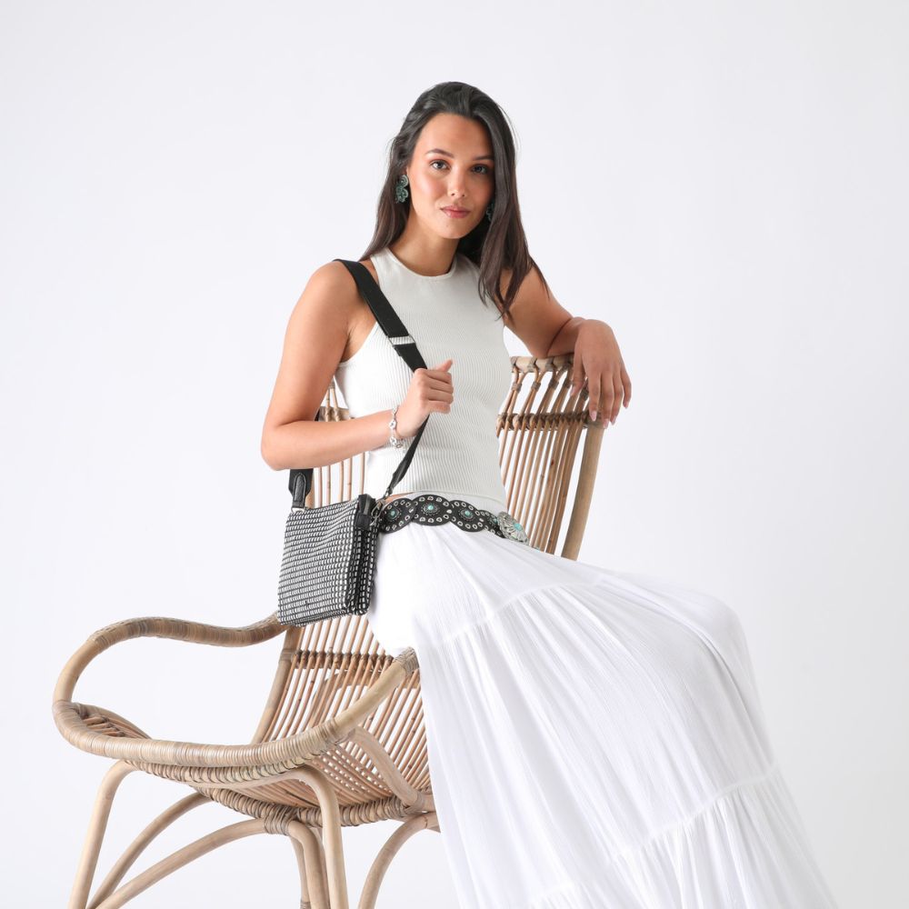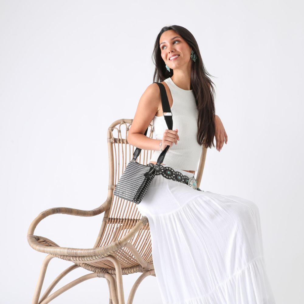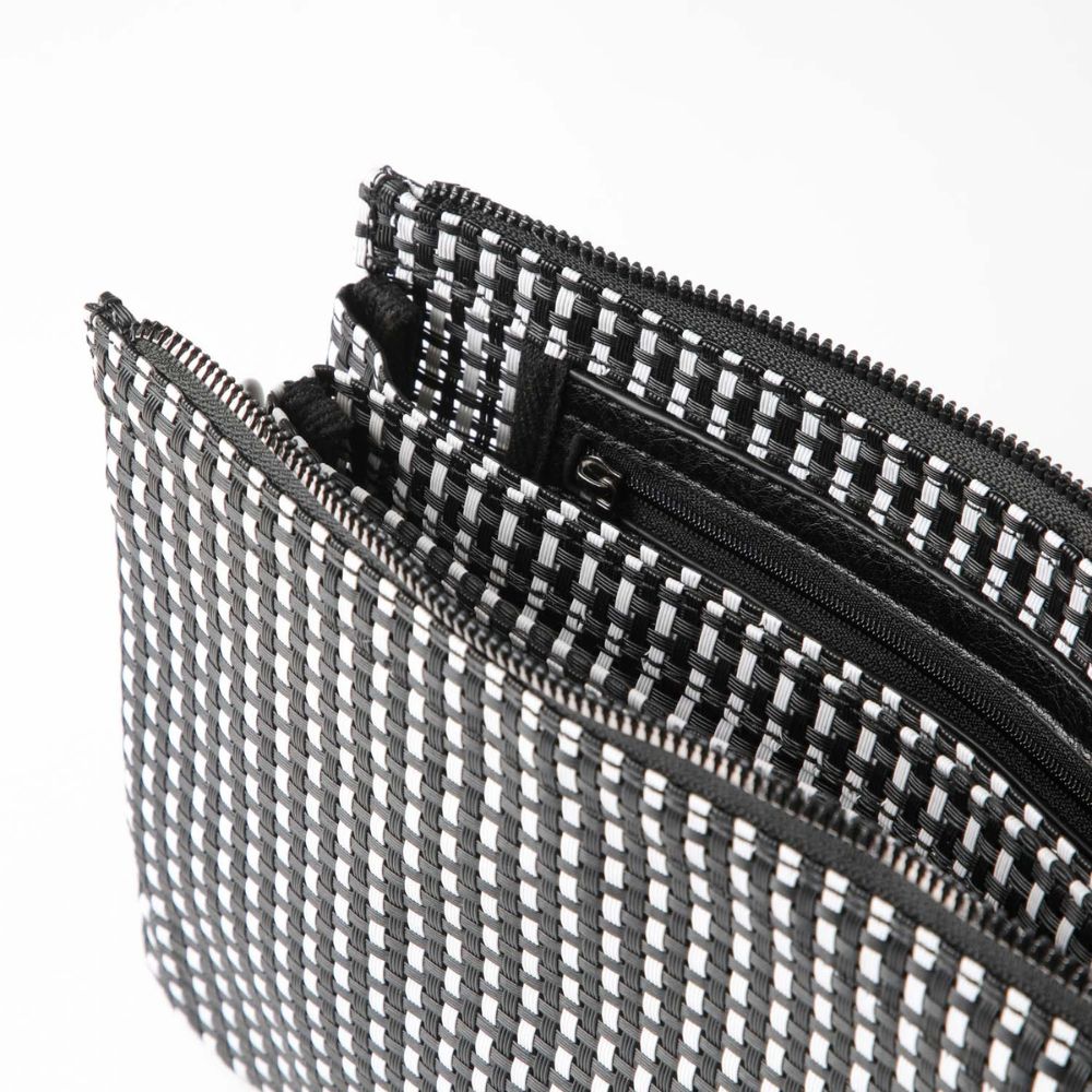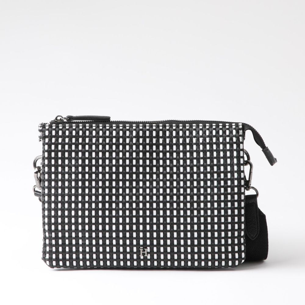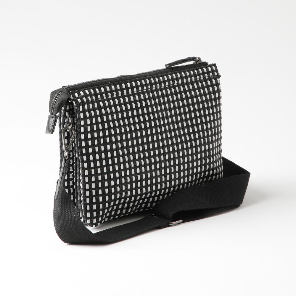 Cartera tejida con un patrón blanco y negro y tiene cierre. Tiene una correa negra ajustable y desmontable. En su interior tiene 3 compartimentos, uno de ellos tiene un bolsillo con cierre. Las argollas y logo son de metal plateado oscuro.