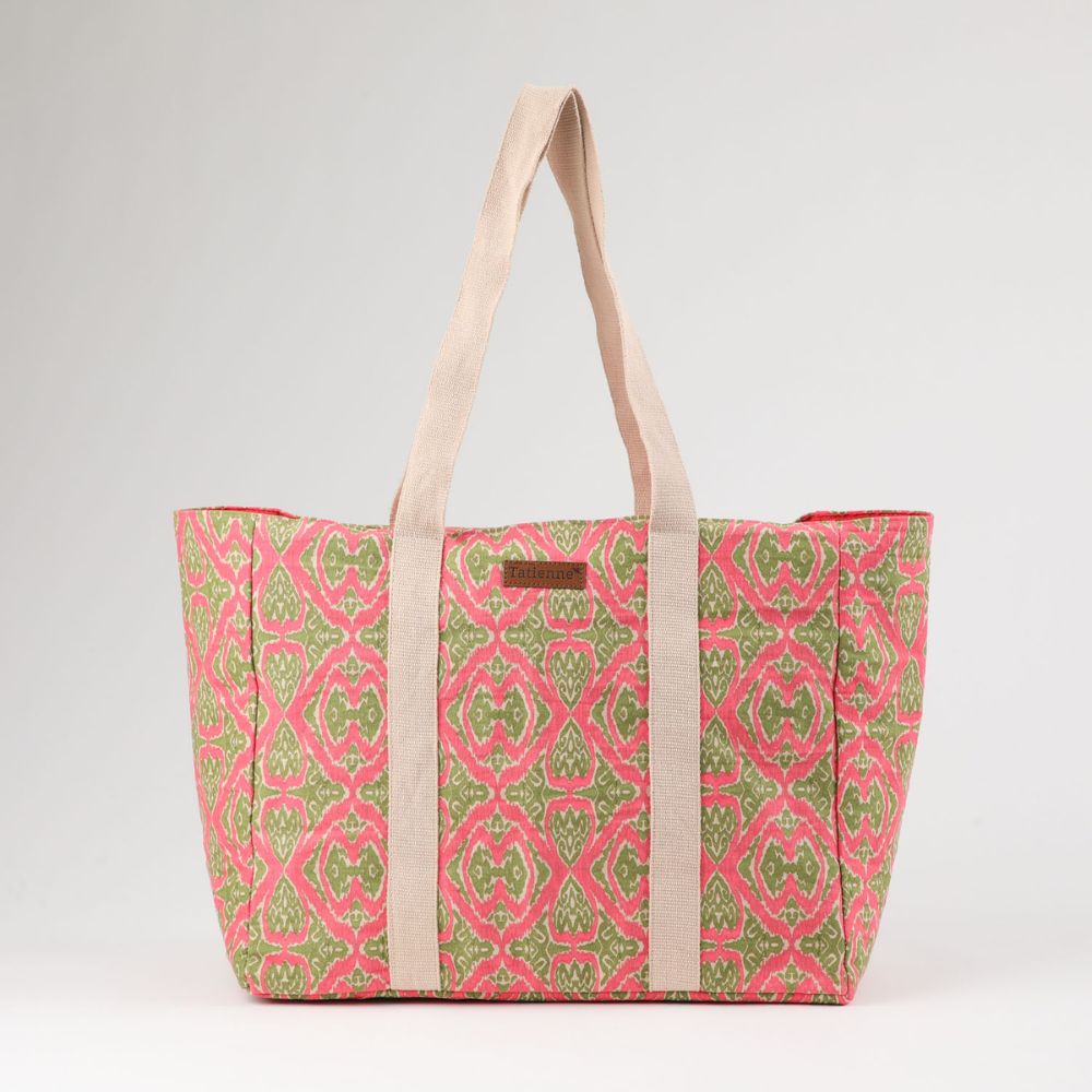 Cartera de hombro tela estampada, rosada con verde. Tiene bolsillos interiores y cierre exterior.