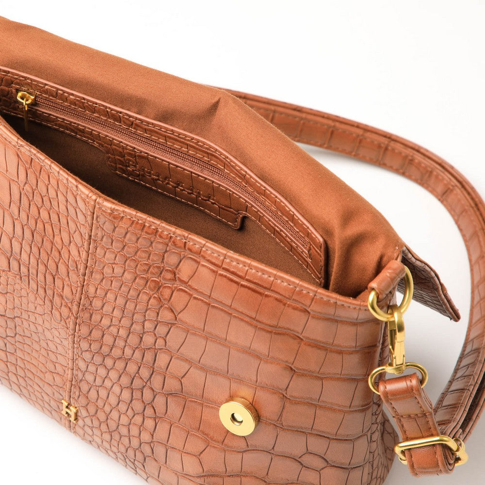 Cartera cruzada en ecocuero color camel con detalles en relieve tipo cocodrilo. Incluye cierre superior y un bolsillo interior con cierre. El diseño incorpora una correa ajustable, ideal para uso diario o casual. El logo "H" en metal dorado al frente aporta un toque sofisticado. Un diseño elegante y funcional.