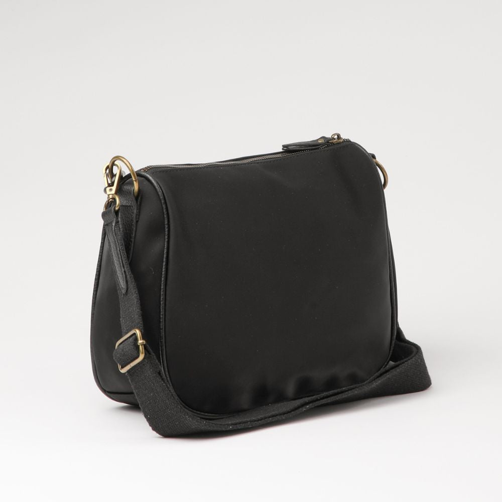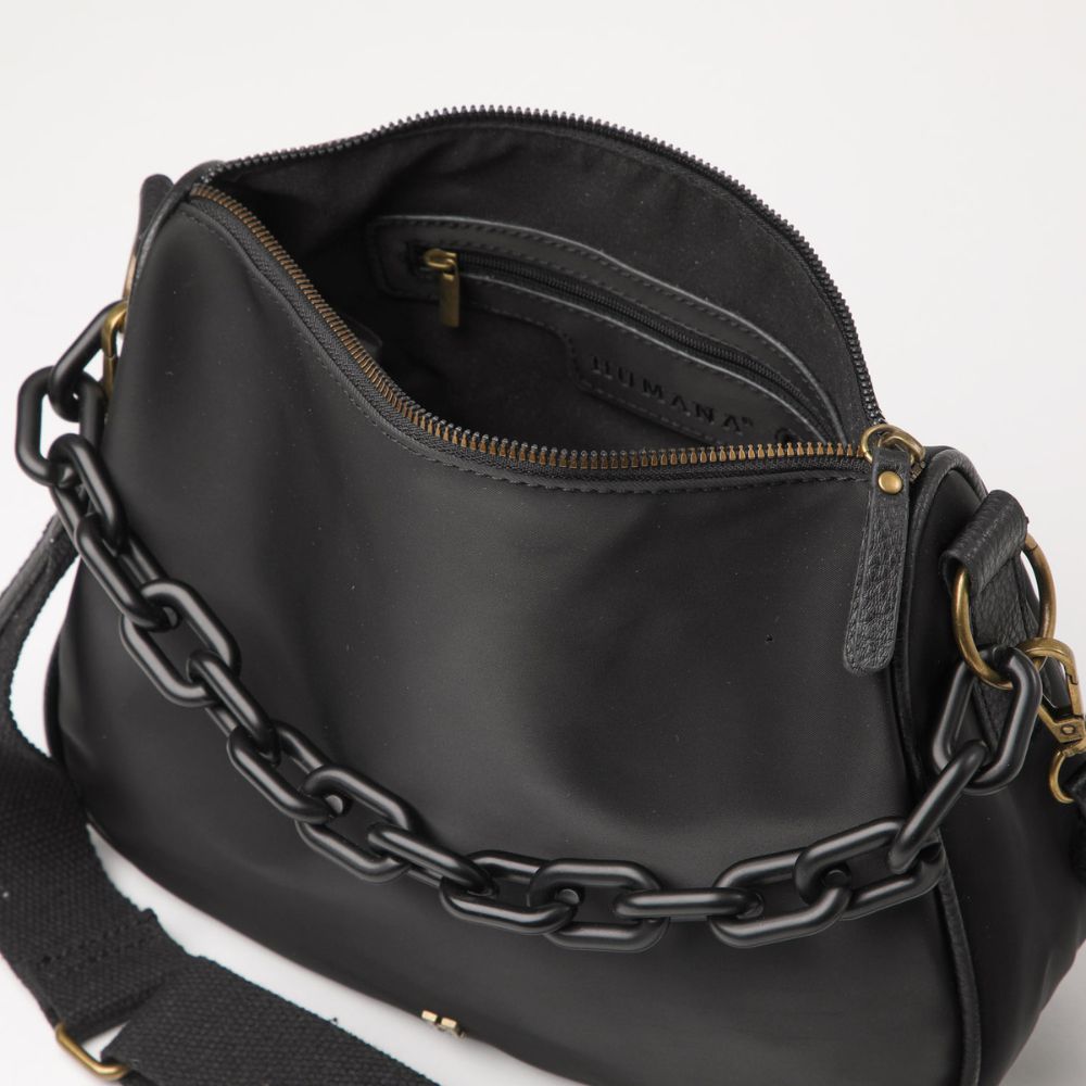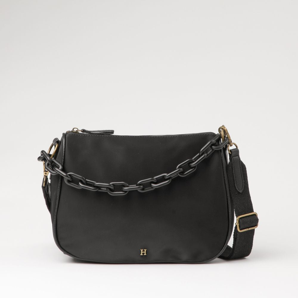 Cartera negra rectangular clásica y simple de nylon, con correa ajustable/desmontable de tela, para utilizarla como cartera de hombro o cruzada. Cuenta con un bolsillo principal con cierre y una cadena de eslabones plásticos. En el interior tiene un bolsillo más pequeño con cierre y otros dos bolsillos abiertos. El cierre, hebilla, ganchos y logo exterior son de metal dorado oscuro.