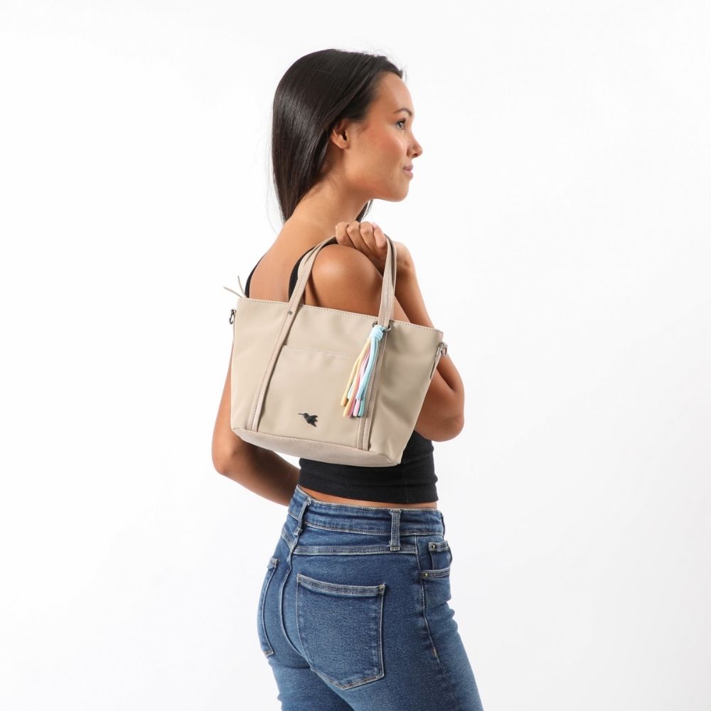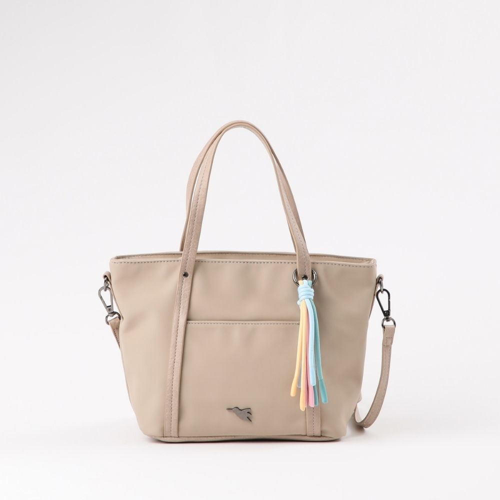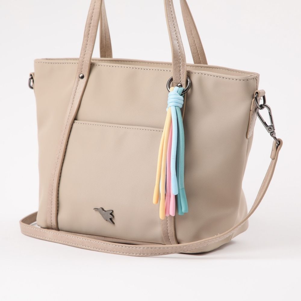 Cartera de nylon beige con cierre, dos asas y correa ajustable/desmontable. Tiene un bolsillo con iman por el frente y en una de sus asas lleva un llavero de cuerdas en colores pasteles. En su interior tiene un bolsillo con cierre y dos abiertos. La base, asas, correa y reforzamientos son de ecocuero y el logo, hebilla, ganchos y tiradores son de metal plateado oscuro.