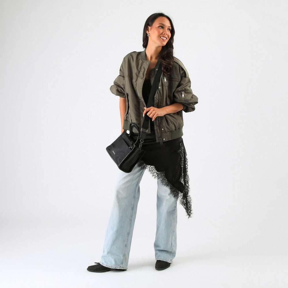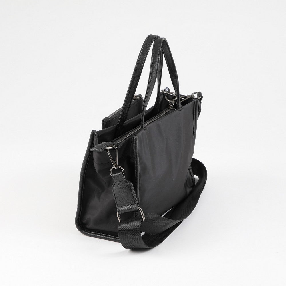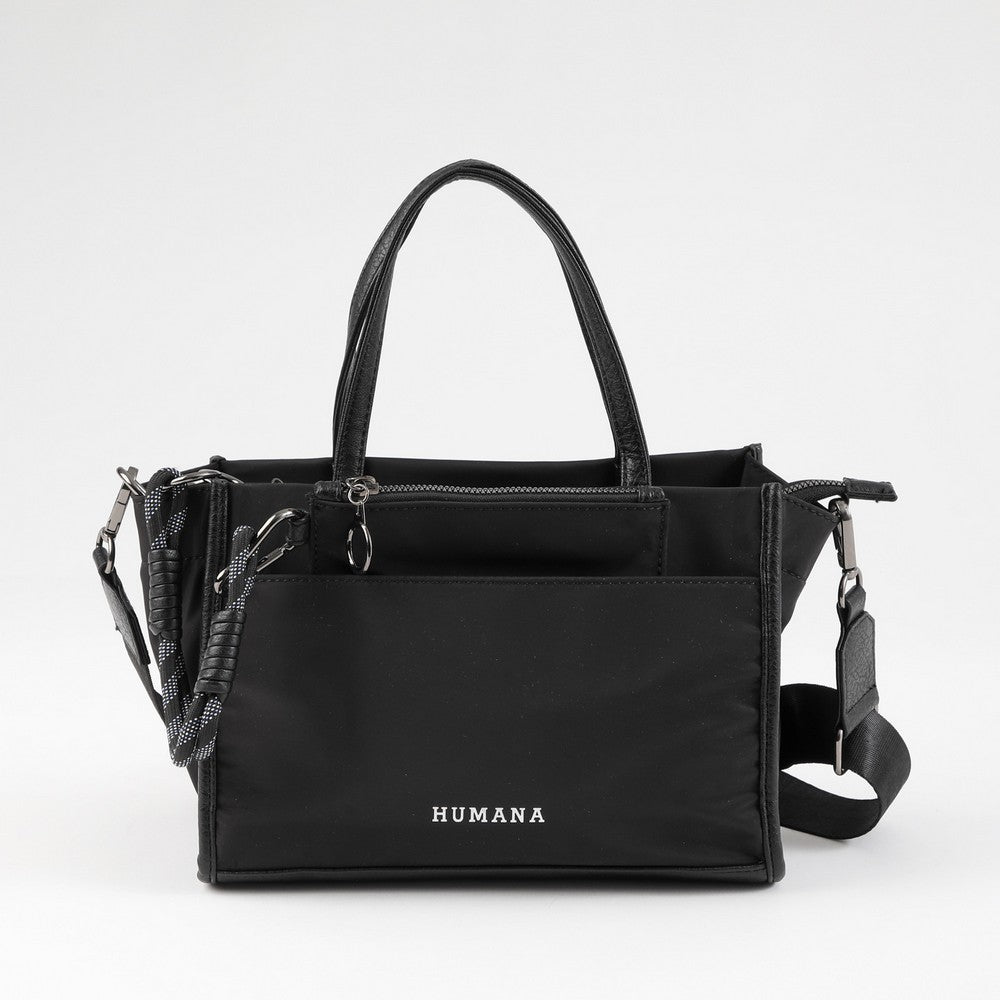 Cartera cruzada en nylon y ecocuero negro, con cuerpo estructurado, asas dobles largas y cortas y bolsillo frontal con cierre. Incluye correa ajustable y desmontable, interior con cierre y logo HUMANA impreso sobre la tela. También trae un estuche removible con cierre. De uso práctico para el día a día gracias a su formato amplio. Un diseño moderno y funcional.