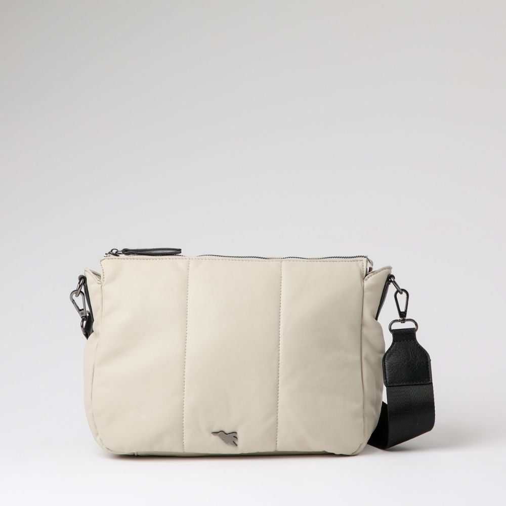 Es una cartera de color marfil con divisiones de costuras acolchadas por la cara delantera y trasera. Cuenta con una correa ajustable/desmontable de tela negra, para utilizarla como cartera de hombro o cruzada. El bolsillo principal lleva cierre y en su interior tiene un bolsillo más pequeño con cierre y otros dos bolsillos abiertos. El cierre, hebilla, ganchos y logo exterior son de metal plateado oscuro.