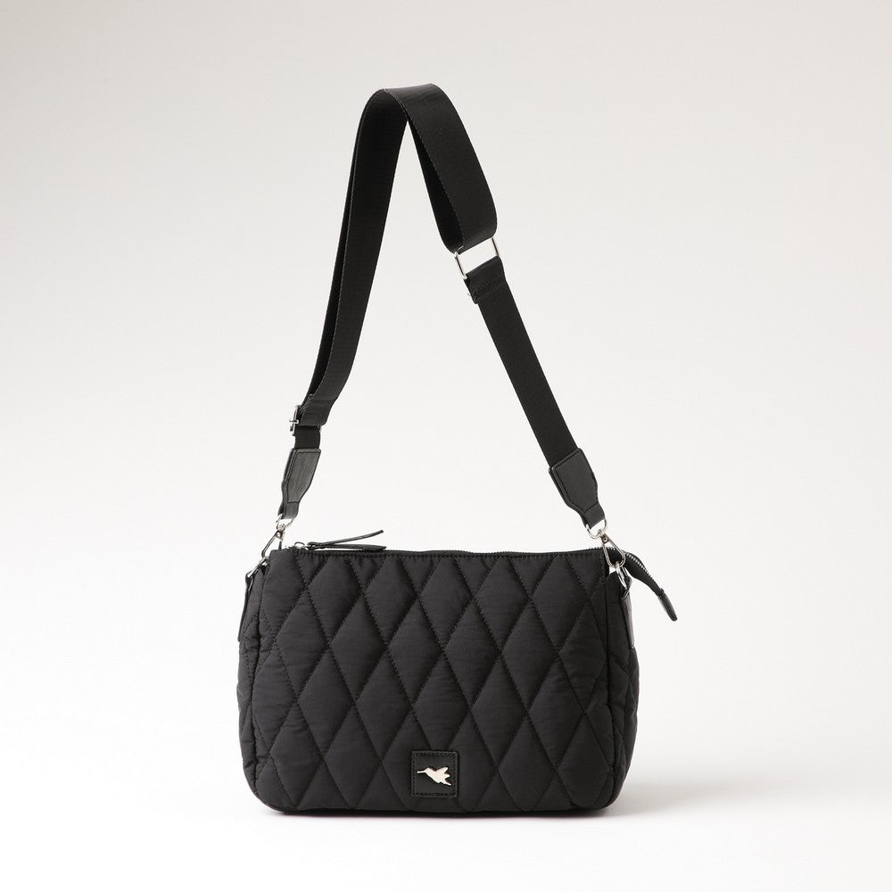 Cartera en color negro, con diseño acolchado. Cuenta con cierre superior y correa desmontable para llevar al hombro o cruzada. En el frente incorpora un aplique metálico del logo de la marca. Un accesorio práctico y fácil de combinar.
