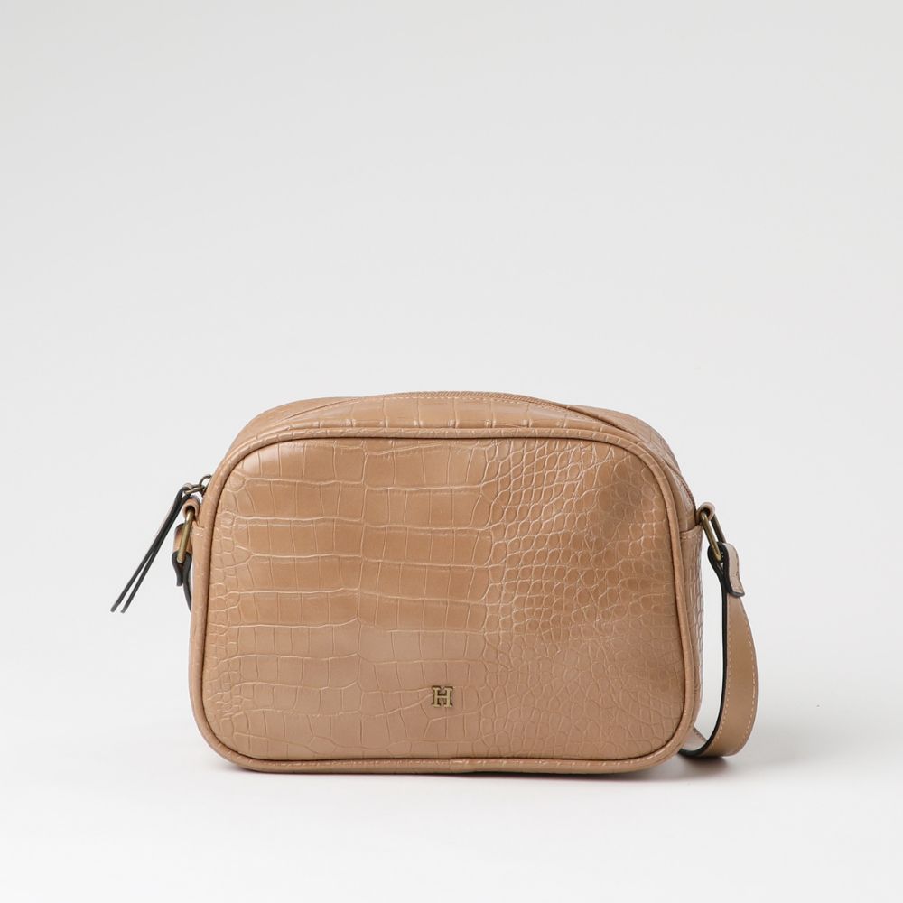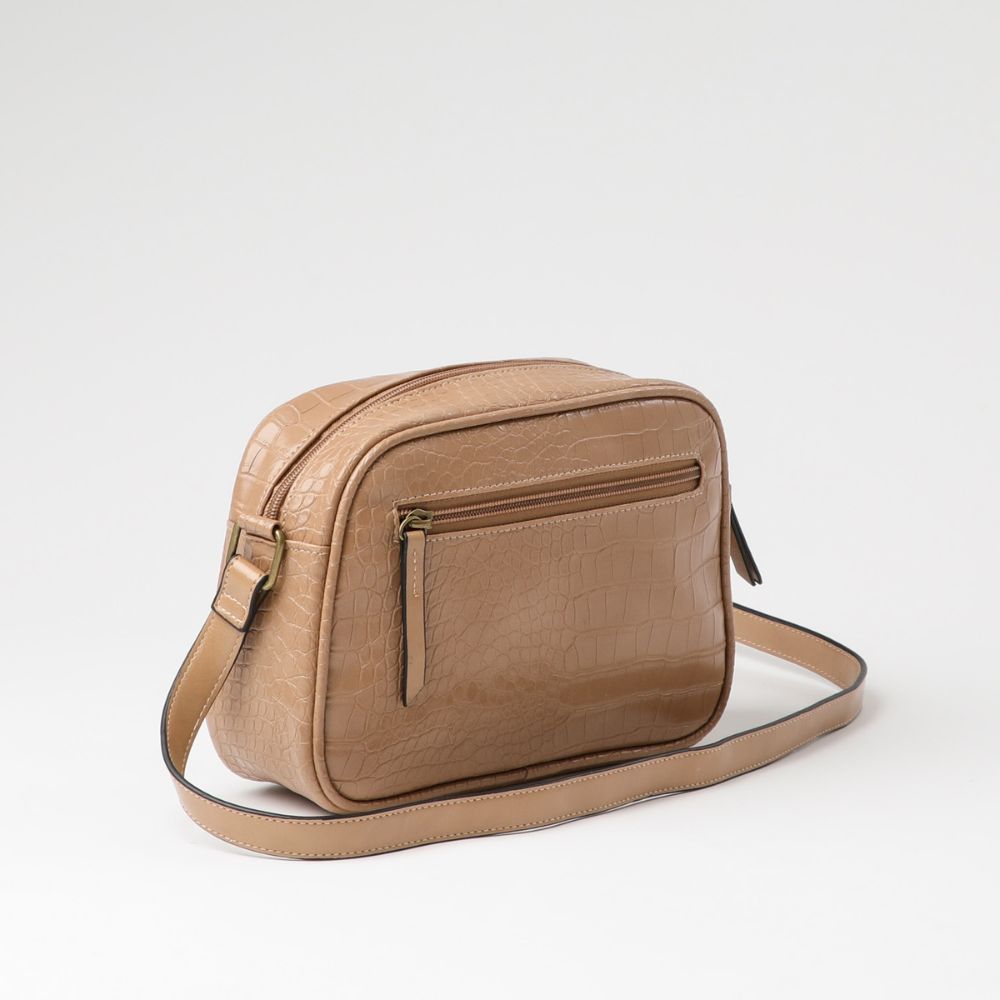 Cartera rectangular de ecocuero beige con textura de cocodrilo y cierre. Lleva una correa ajustable para llevarla como cartera de hombro o cruzada. En su interior tiene un bolsillo con cierre y otros 2 abiertos. El logo, hebillas y argollas son de metal dorado oscuro.