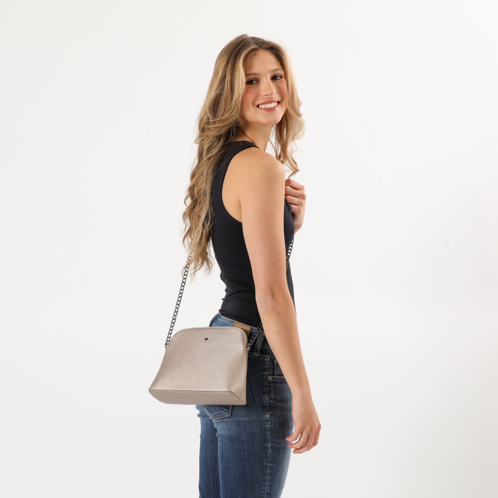 Cartera de ecocuero dorado oscuro con correa de cadena para llaverla como cartera de hombro. Lleva cierre, por el revé tiene un bolsillo abierto y en su interior tiene otro bolsillo con cierre. La correa, cierre, tiradores y logo son de metal plateado oscuro.