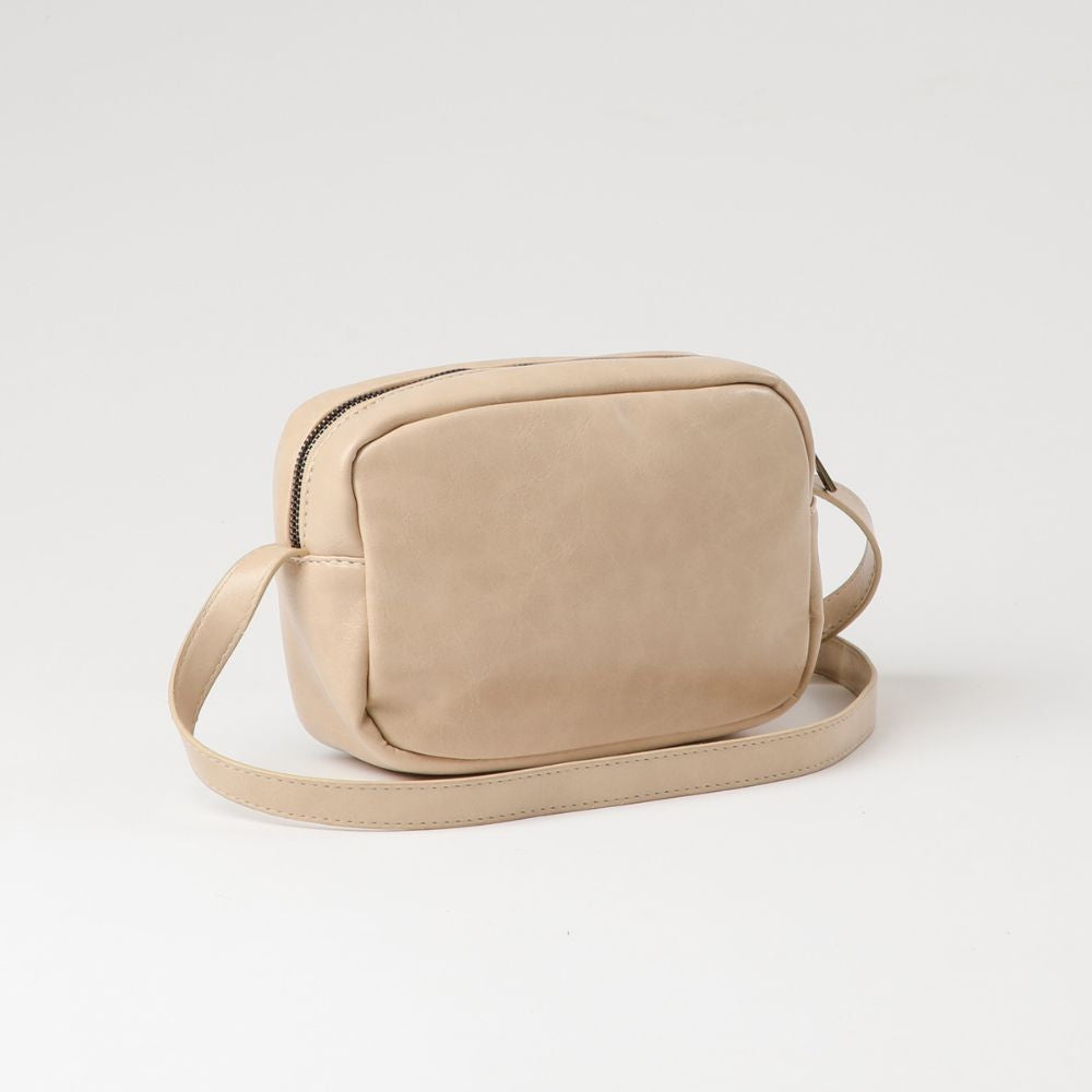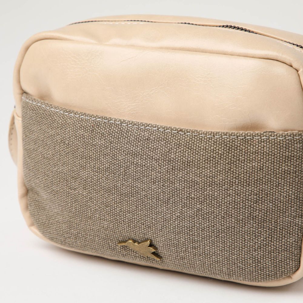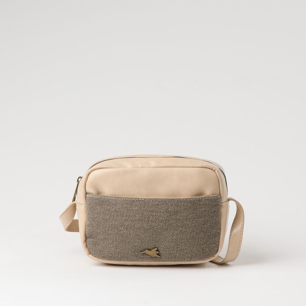 Cartera rectangular de ecocuero beige con cierre. Lleva correa ajustable para llaverla como cartera de hombro o cruzada. Por el frente hay un bolsillo abierto de tela más oscura y por el interior tiene un bolsillo con cierre y 2 bolsillos abiertos. El cierre, hebillas y logo son de metal dorado oscuro.