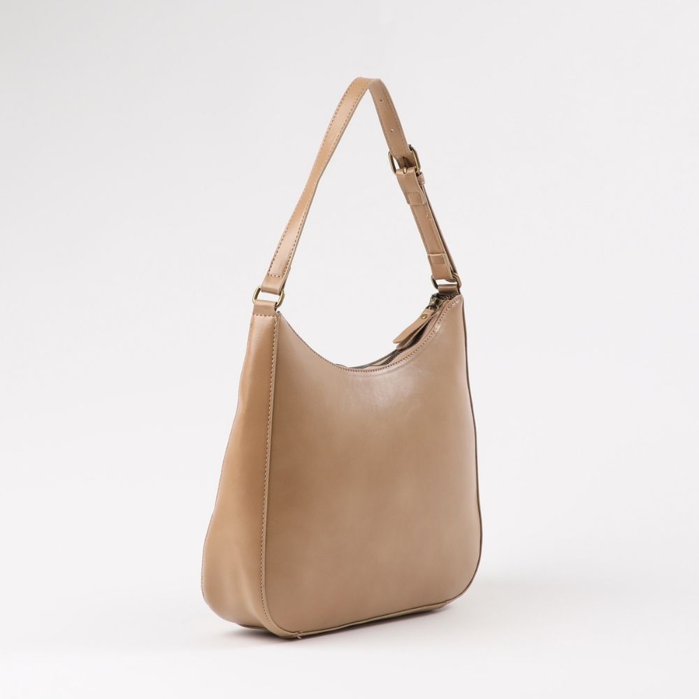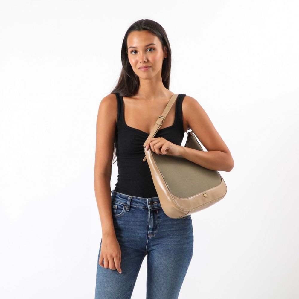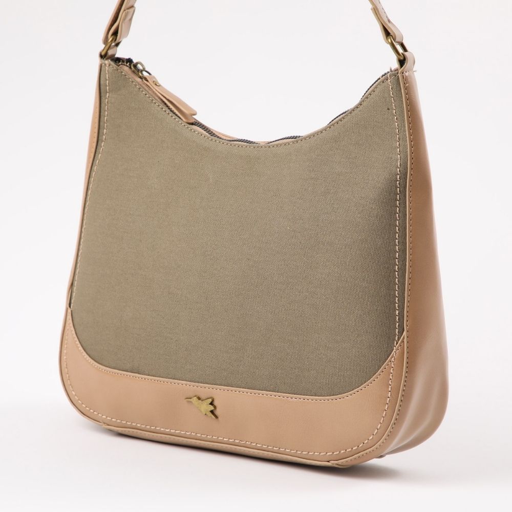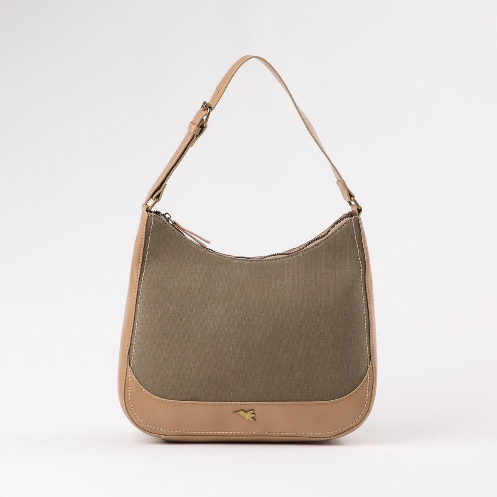 Cartera de ecocuero beige con cierre y asa ajustable para llevarla como cartera de hombro. El frente lleva tela verde y en su interior tiene un bolsillo con cierre y dos abiertos. El logo, hebilla y cierre son de metal dorado oscuro.