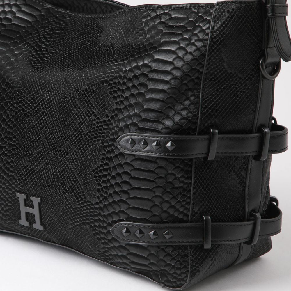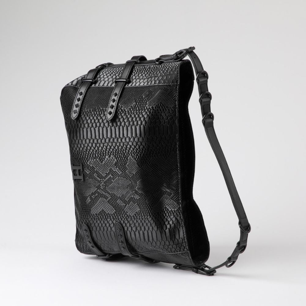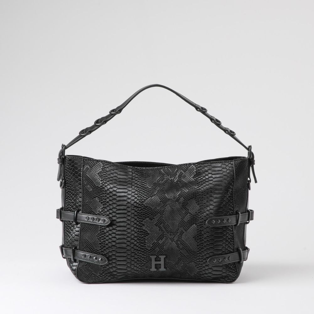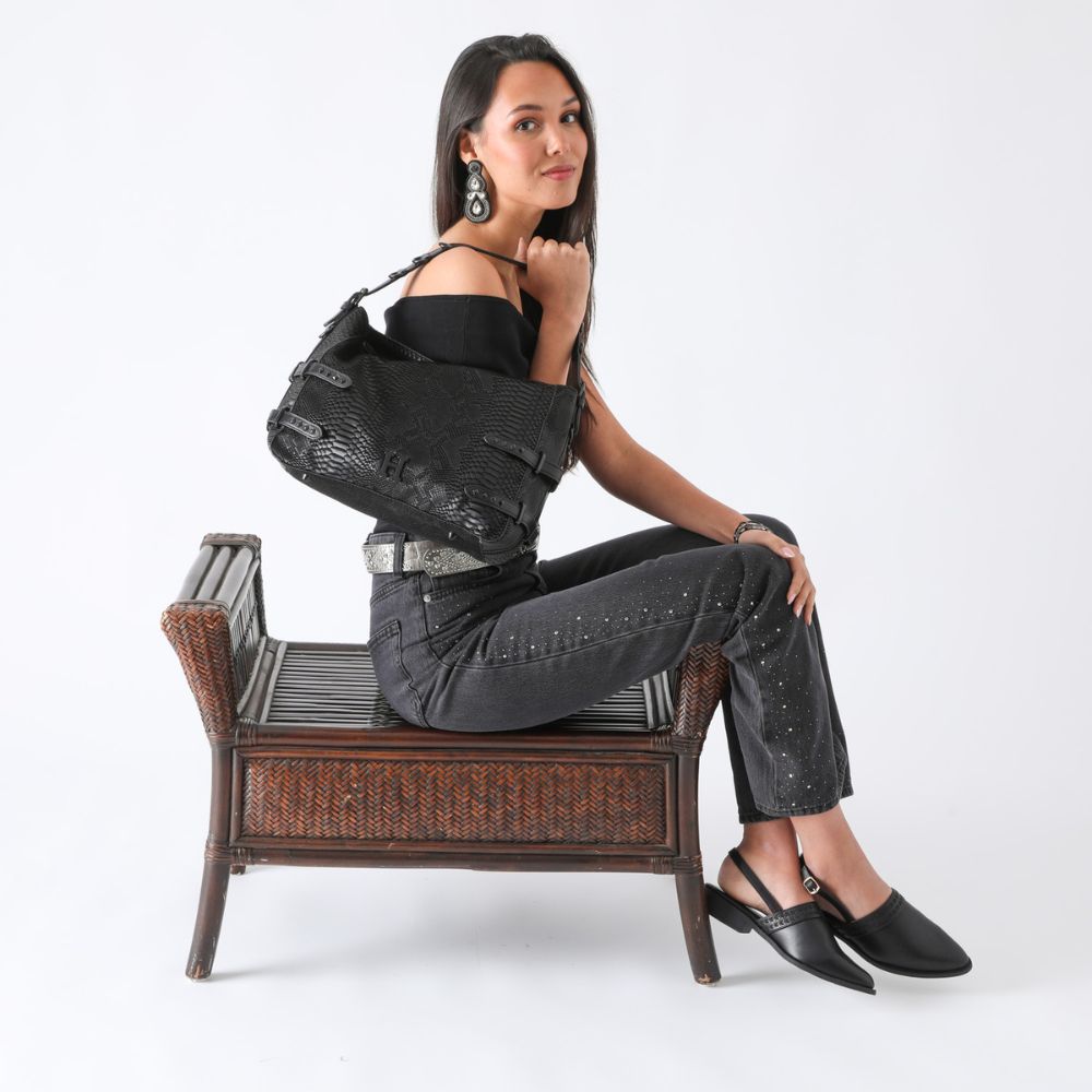 Cartera de ecocuero negro con diseño de cocodrilo. Tiene una correa ajustable que permite llevarla al hombro y cierre. Al interior tiene un bolsillo con cierre y dos abiertos. En el frente también tiene tachas. El logo, tiradores y tachas son de metal negro.