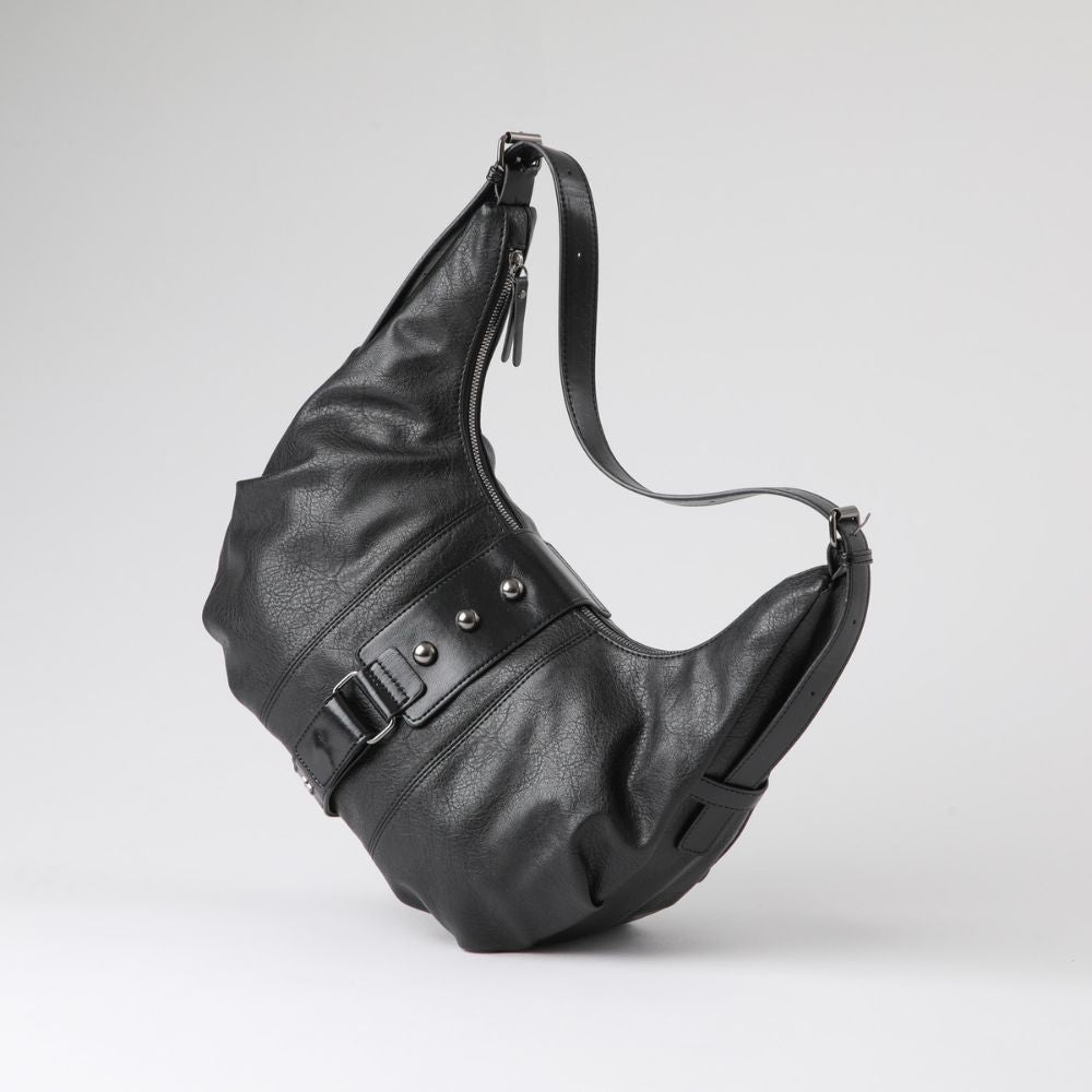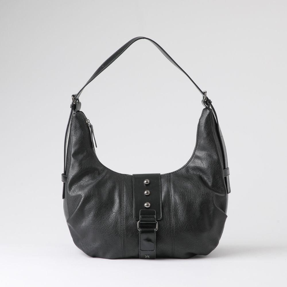 Cartera de ecocuero negro con cierre y una correa ajustable que permite llevarla al hombro. En el interior tiene un bolsillo con cierre y dos abiertos. Por delante tiene 3 tachas circulares. El tirador, logo y tachas son de metal plateado oscuro.