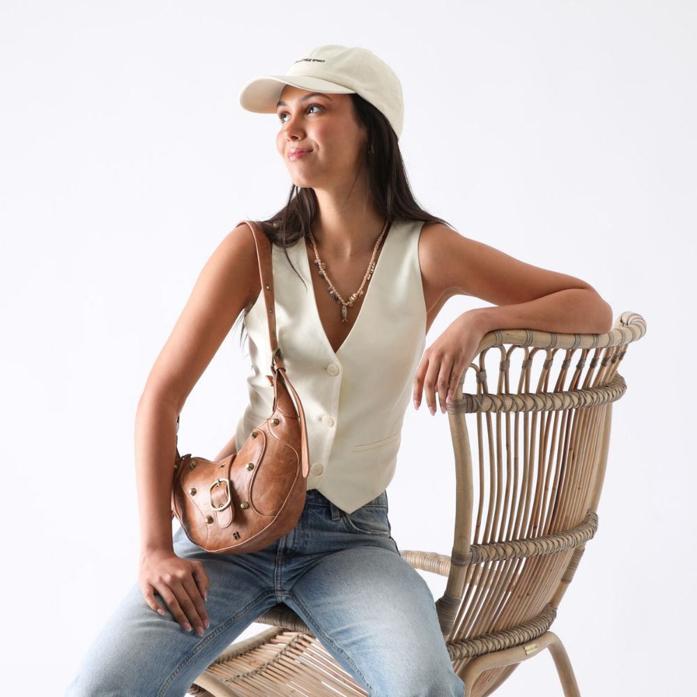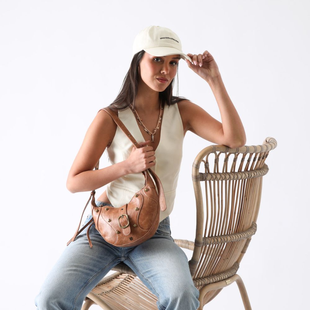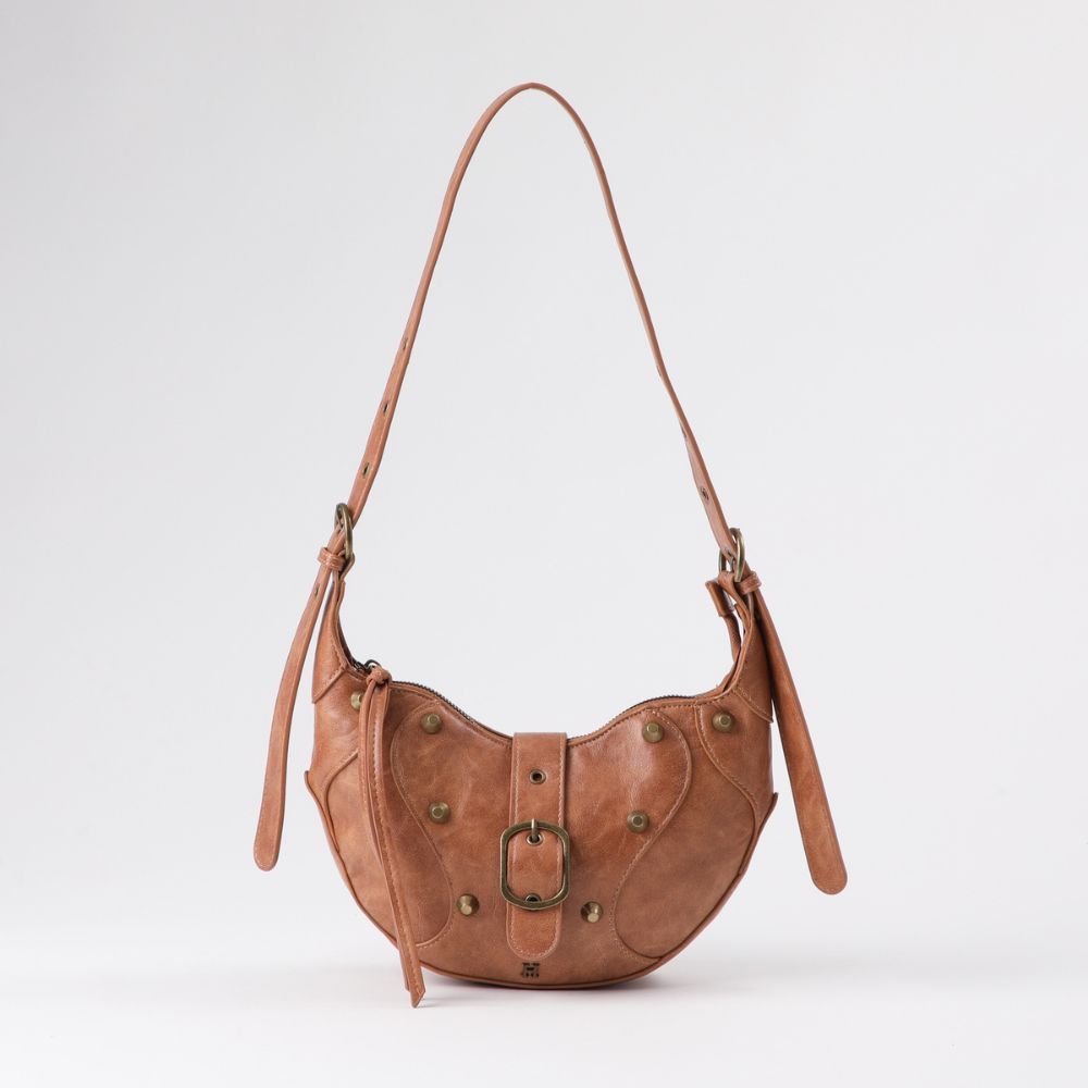 Cartera de ecocuero camel de hombro con cierre y tachas. La correa es ajustable y al interior tiene un bolsillo con cierre y uno abierto. El snap, tachas, tiradores y logo son de metal dorado oscuro.