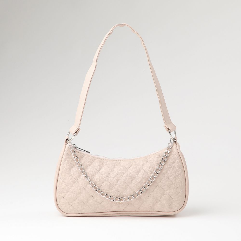 Cartera de hombro de ecocuero beige con cierre. Tiene una correa de ecocuero y una cadena que permite llevarla al hombro. Los eslabones, argollas y cierre son de metal plateado.