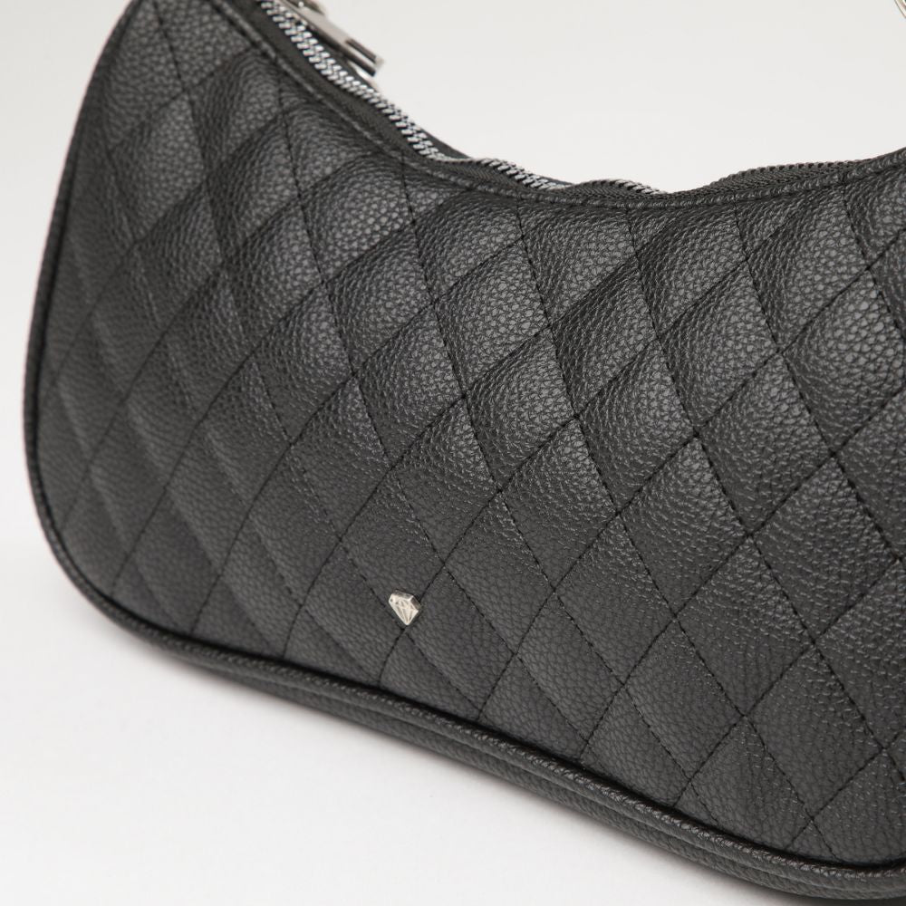 Cartera de hombro de ecocuero negro con cierre. Tiene una correa de ecocuero y una cadena que permite llevarla al hombro. Los eslabones, argollas y cierre son de metal plateado.