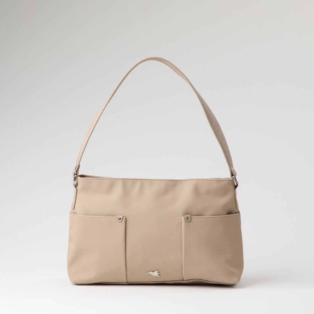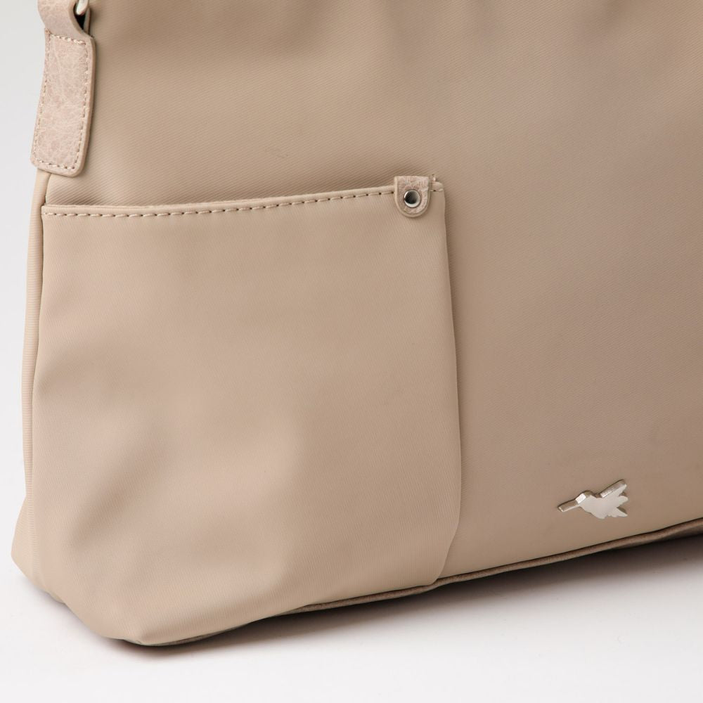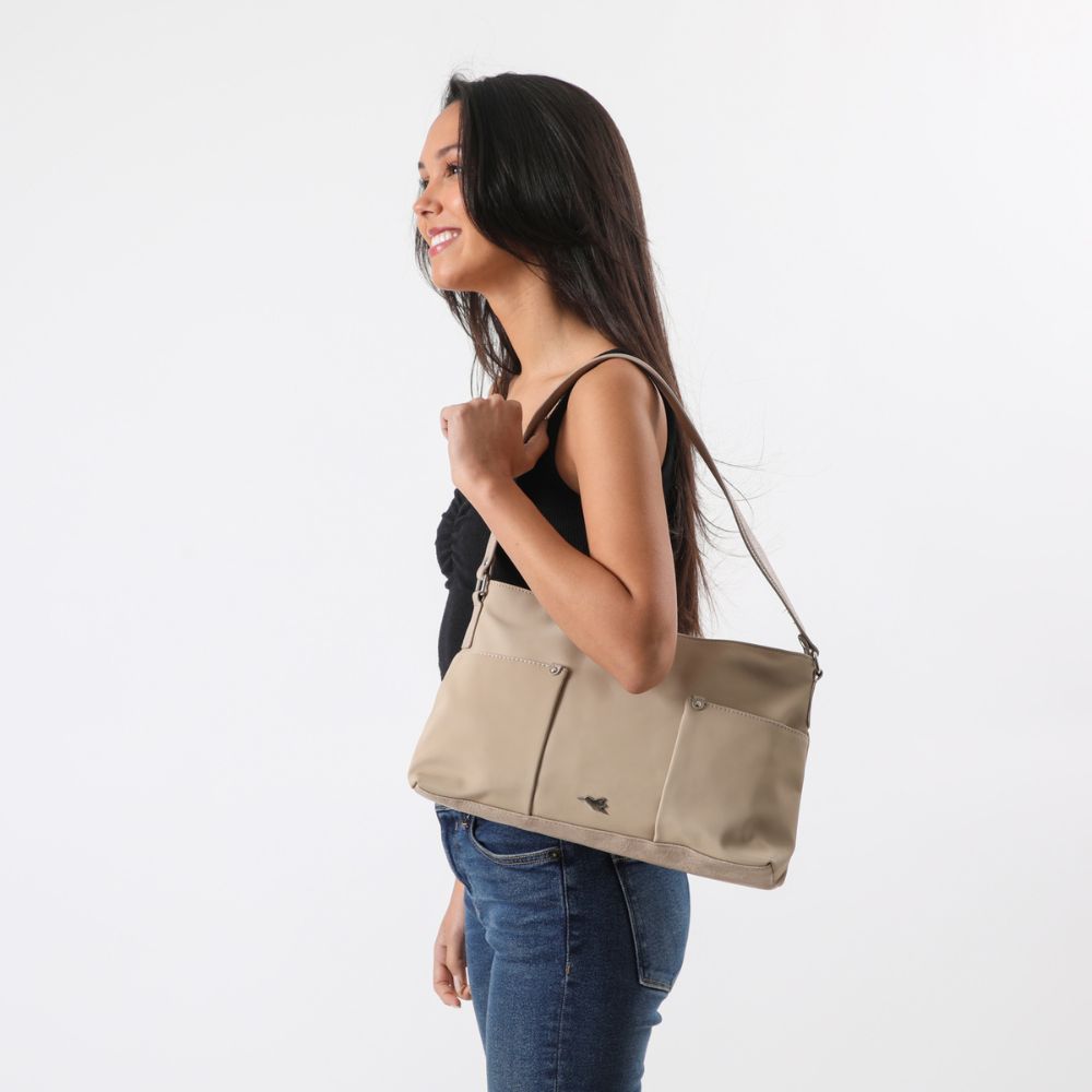 Es una cartera beige de nylon, con una base y un asa para utilizarla como cartera de hombro, de ecocuero. En su exterior lleva dos bolsillos abiertos por los costados y el bolsillo principal con cierre. En su interior tiene un bolsillo más pequeño con cierre y otros dos bolsillos abiertos. El cierre, hebilla y logo exterior son de metal plateado.