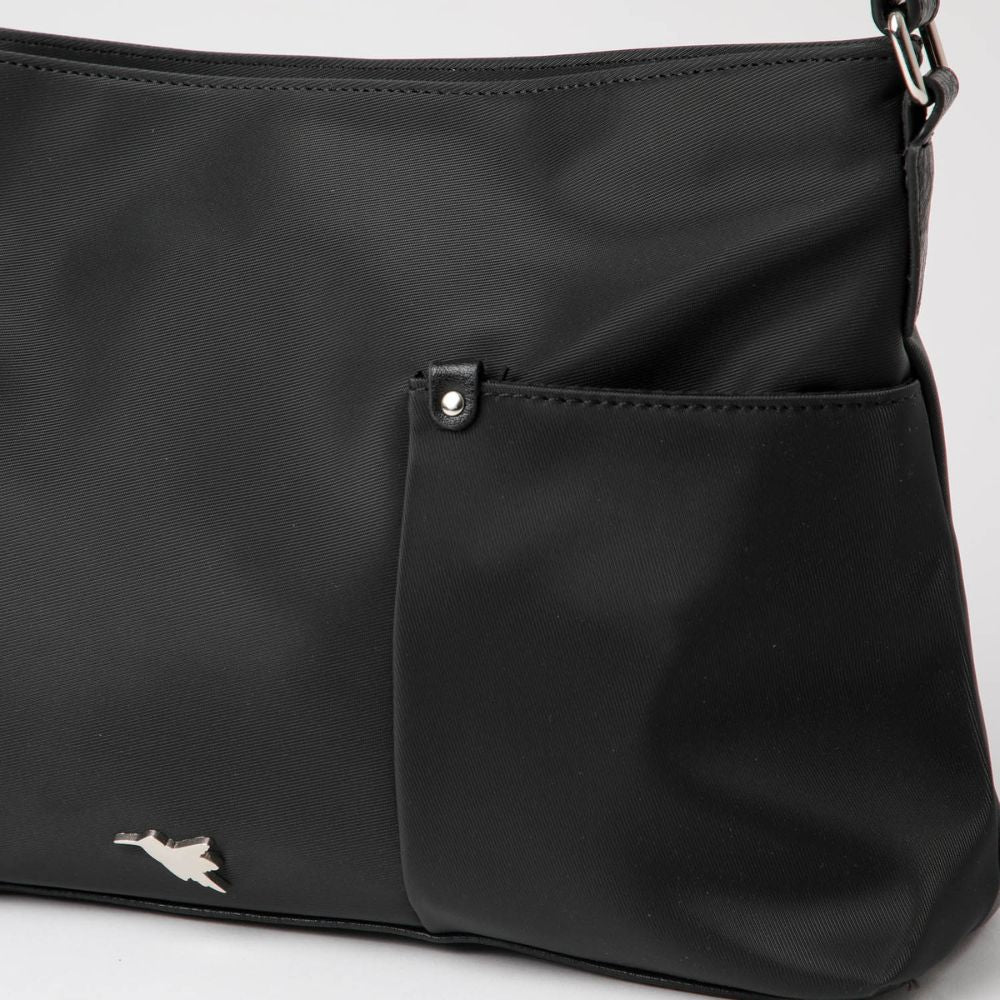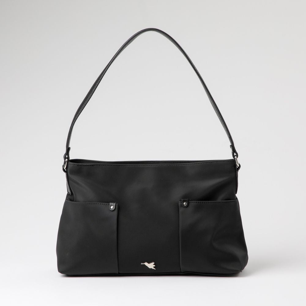 Es una cartera negra de nylon, con una base y un asa para utilizarla como cartera de hombro, de ecocuero. En su exterior lleva dos bolsillos abiertos por los costados y el bolsillo principal con cierre. En su interior tiene un bolsillo más pequeño con cierre y otros dos bolsillos abiertos. El cierre, hebilla y logo exterior son de metal plateado.